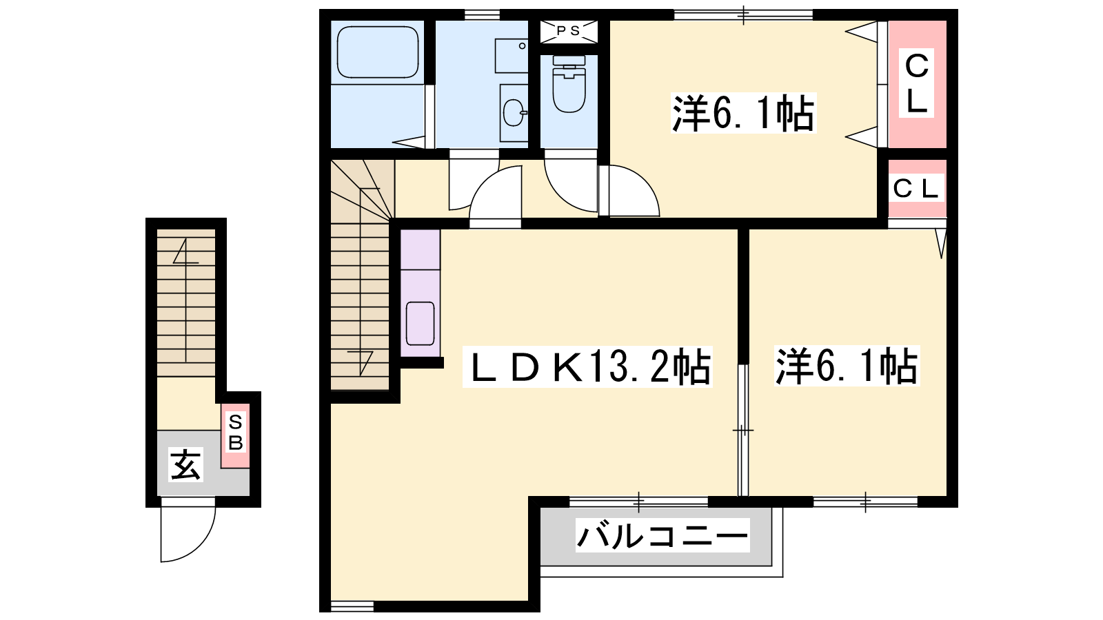 - LDK13.2帖、洋室6.1帖、洋室6.1帖