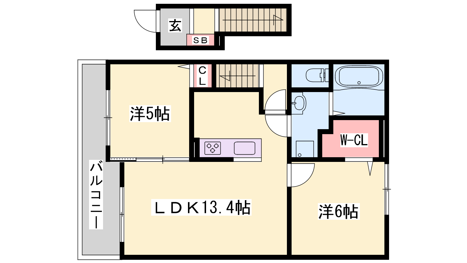 - LDK13.4帖、洋室6帖、洋室5帖