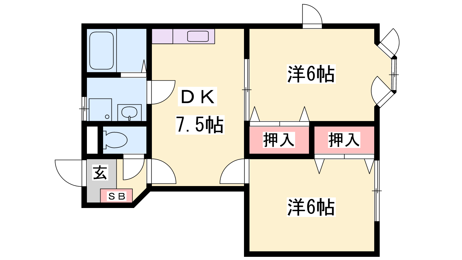 - DK7.5帖、洋室6帖、洋室6帖