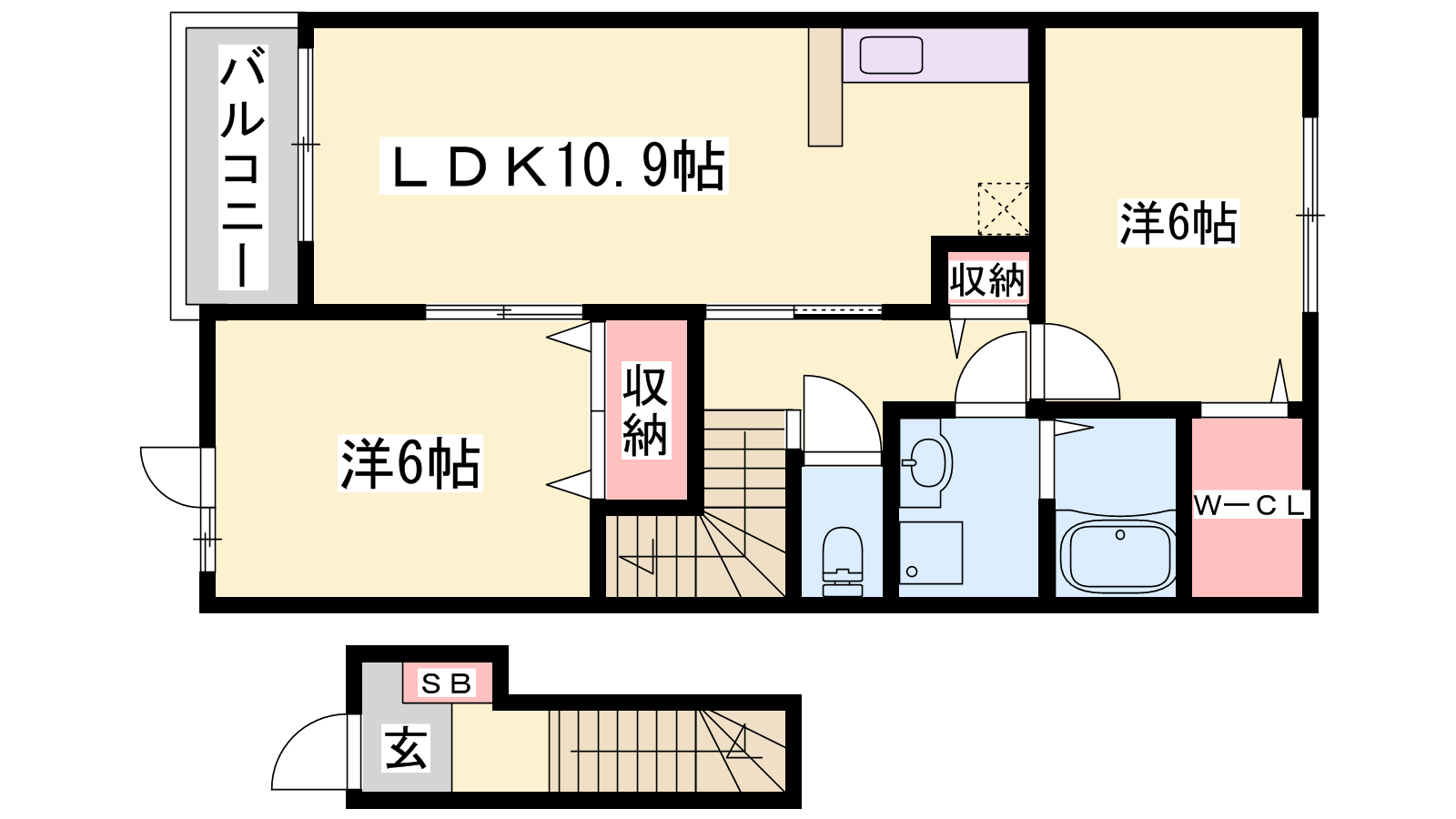 - LDK10.9帖、洋室6帖、洋室6帖