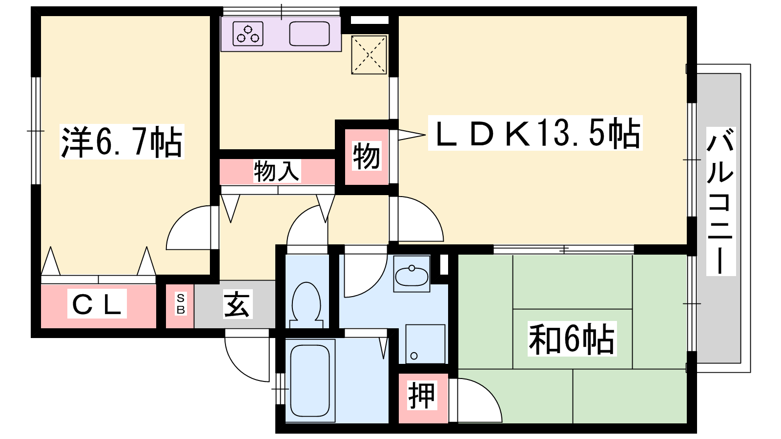 - LDK13.5帖、洋室6.7帖、和室6帖