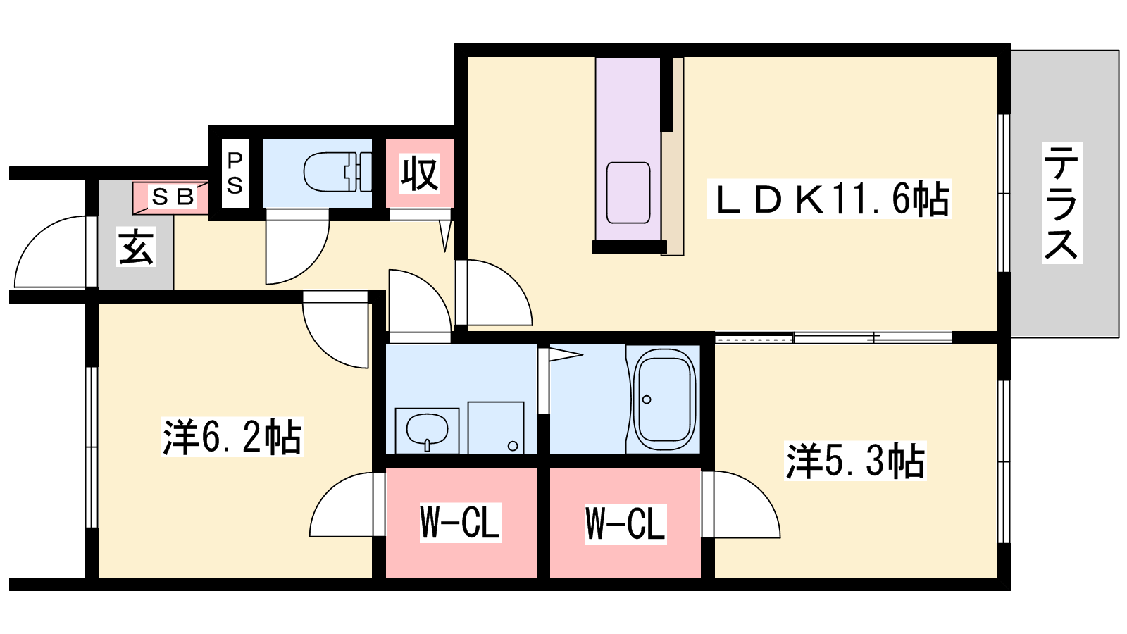 - LDK11.6帖、洋室6.2帖、洋室5.3帖