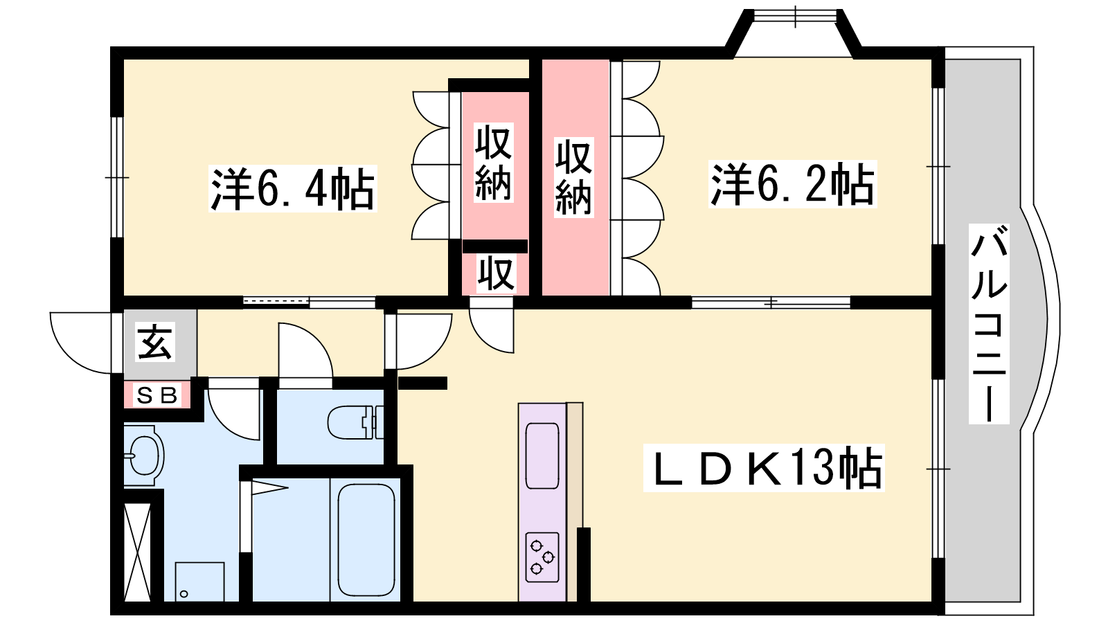 - LDK13帖、洋室6.4帖、洋室6.2帖