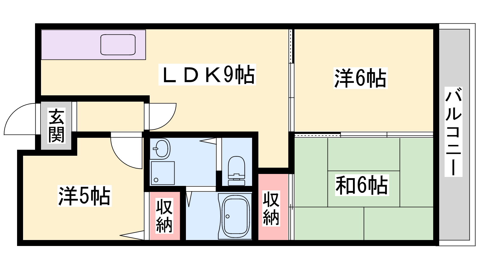 - LDK9帖、洋室6帖、洋室5帖、和室6帖