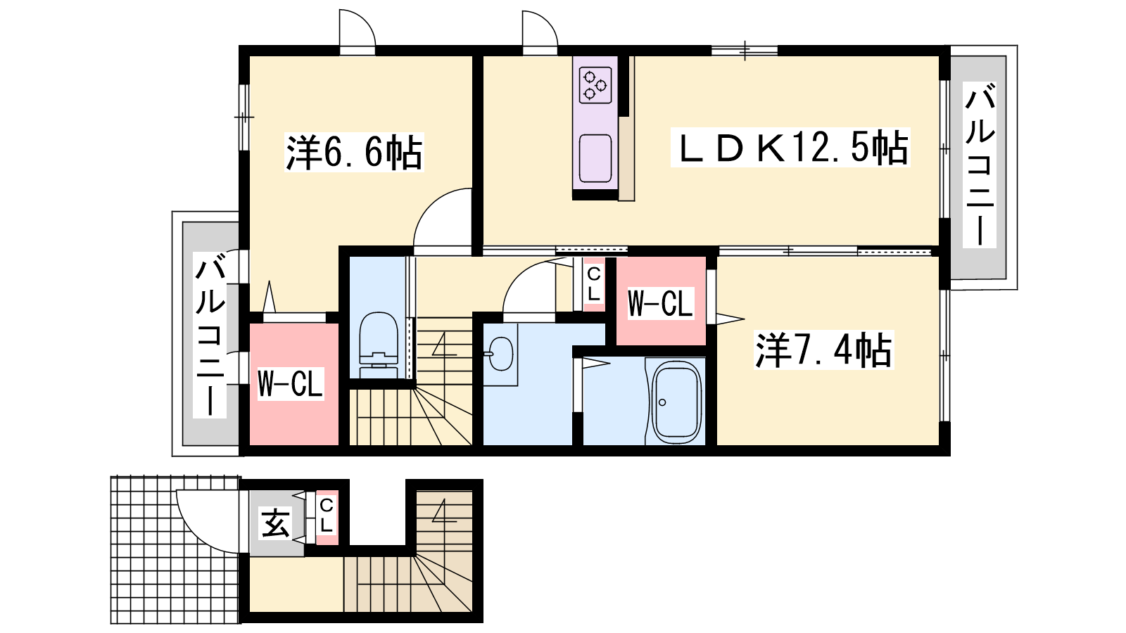 - LDK12.5帖、洋室7.4帖、洋室6.6帖
