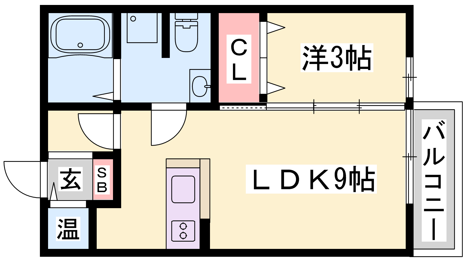 - LDK9帖、洋室3帖