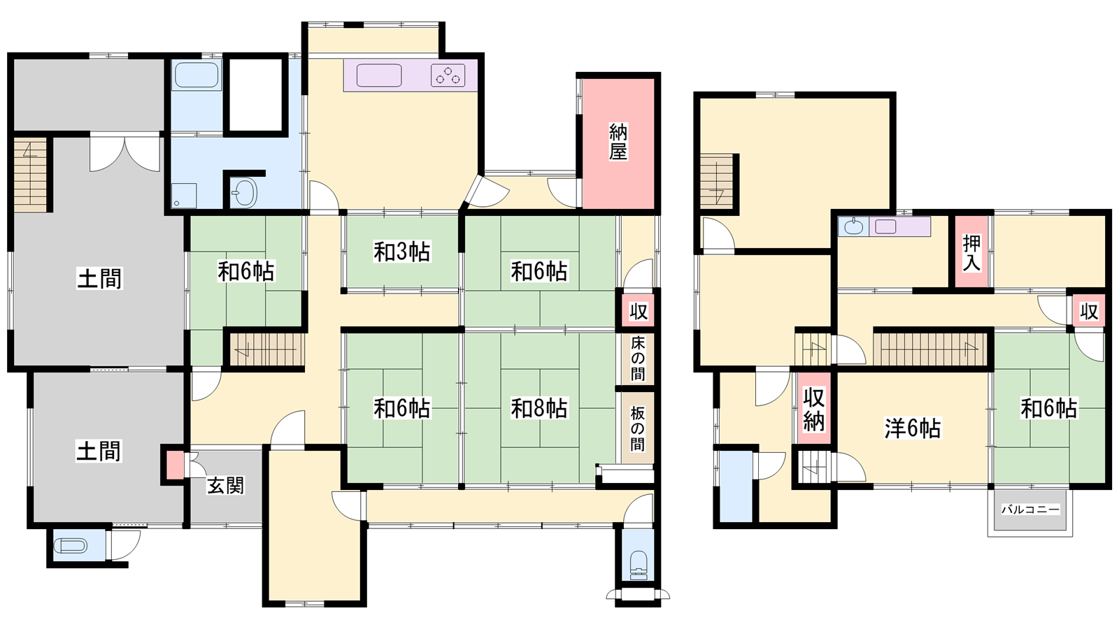- 和室8帖、洋室6帖、和室6帖、和室6帖、和室6帖、和室6帖、和室3帖