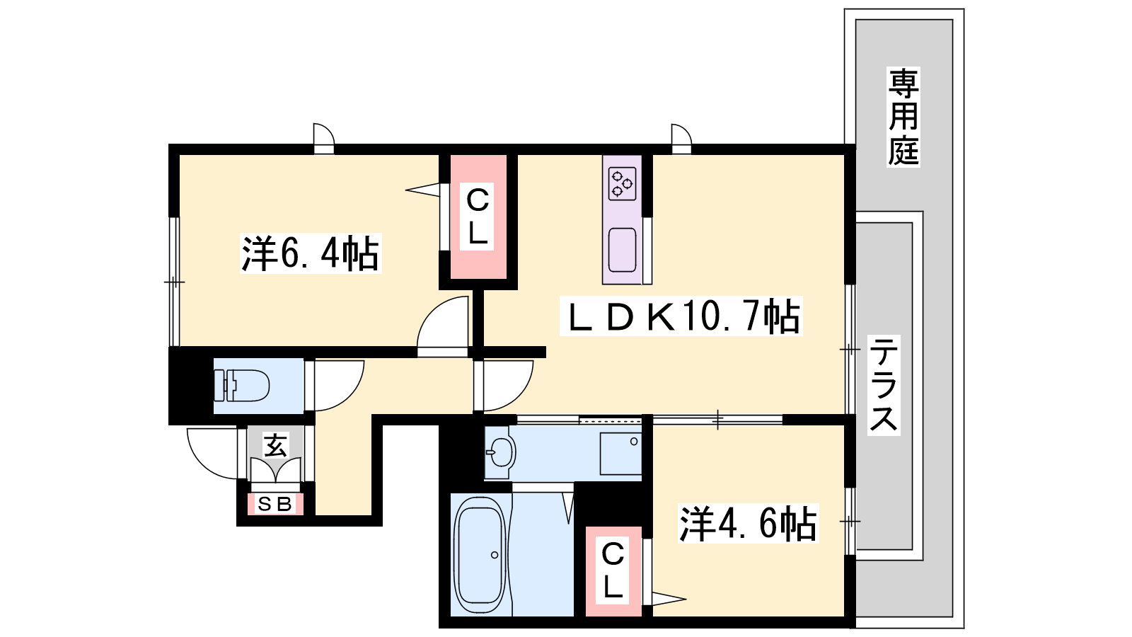 - LDK10.7帖、洋室6.4帖、洋室4.6帖