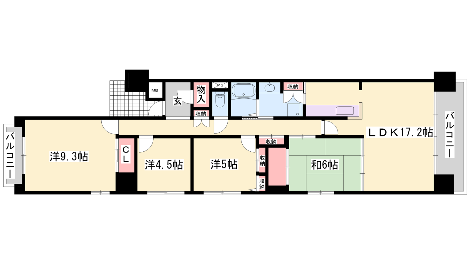 - LDK17.2帖、洋室9.3帖、洋室5帖、洋室4.5帖、和室6帖