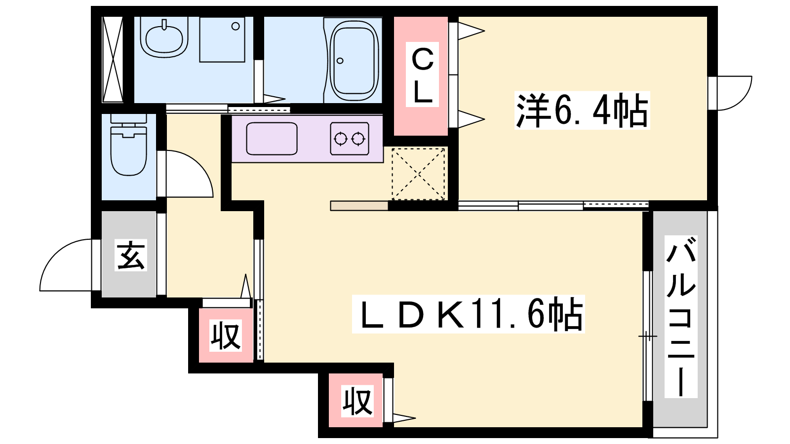 - LDK11.6帖、洋室6.4帖