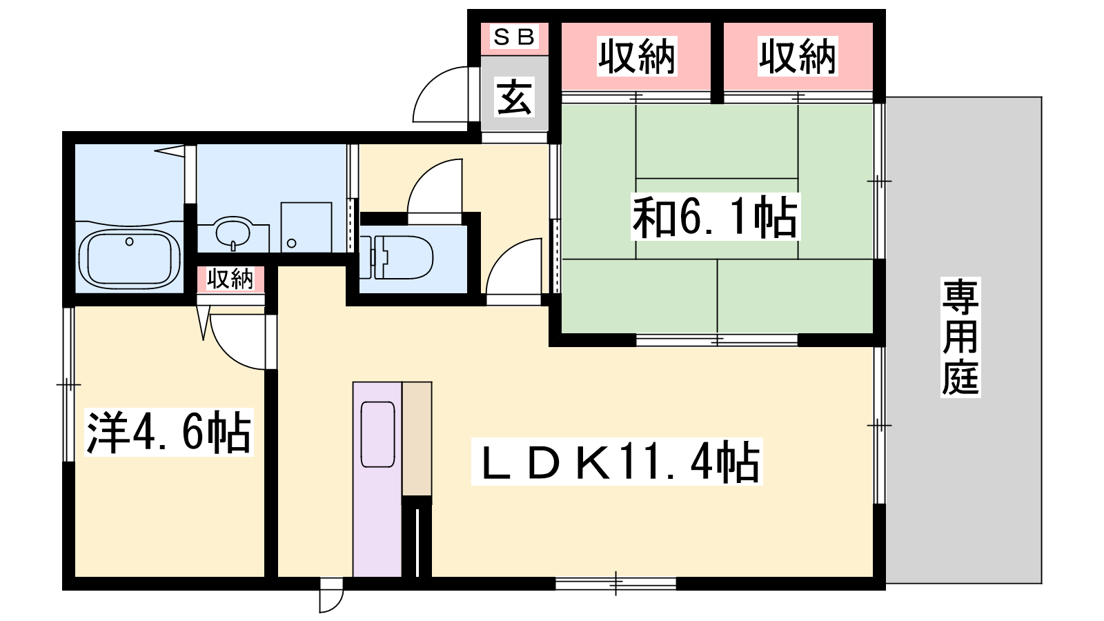 - LDK11.4帖、洋室4.6帖、和室6.1帖