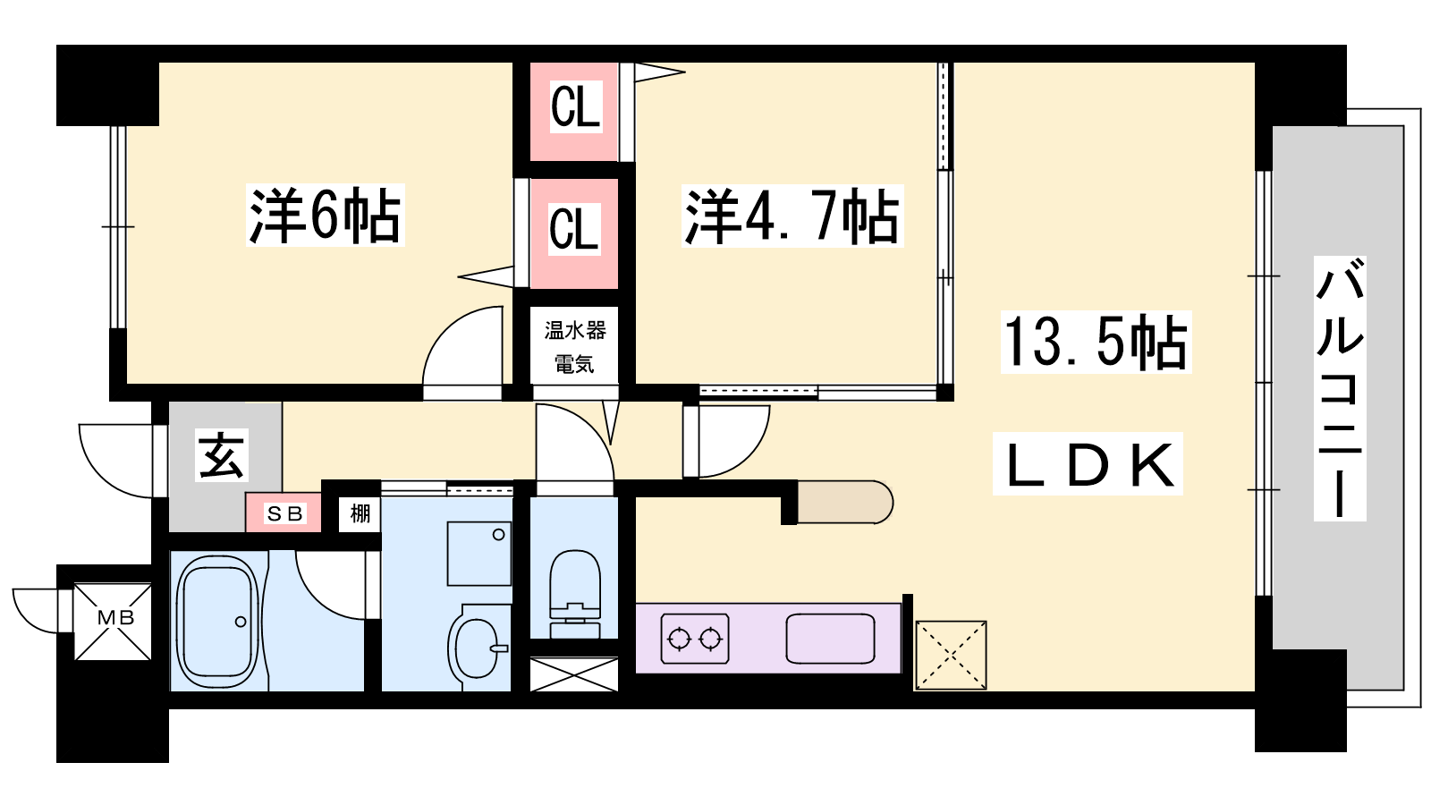 - LDK13.5帖、洋室6帖、洋室4.7帖