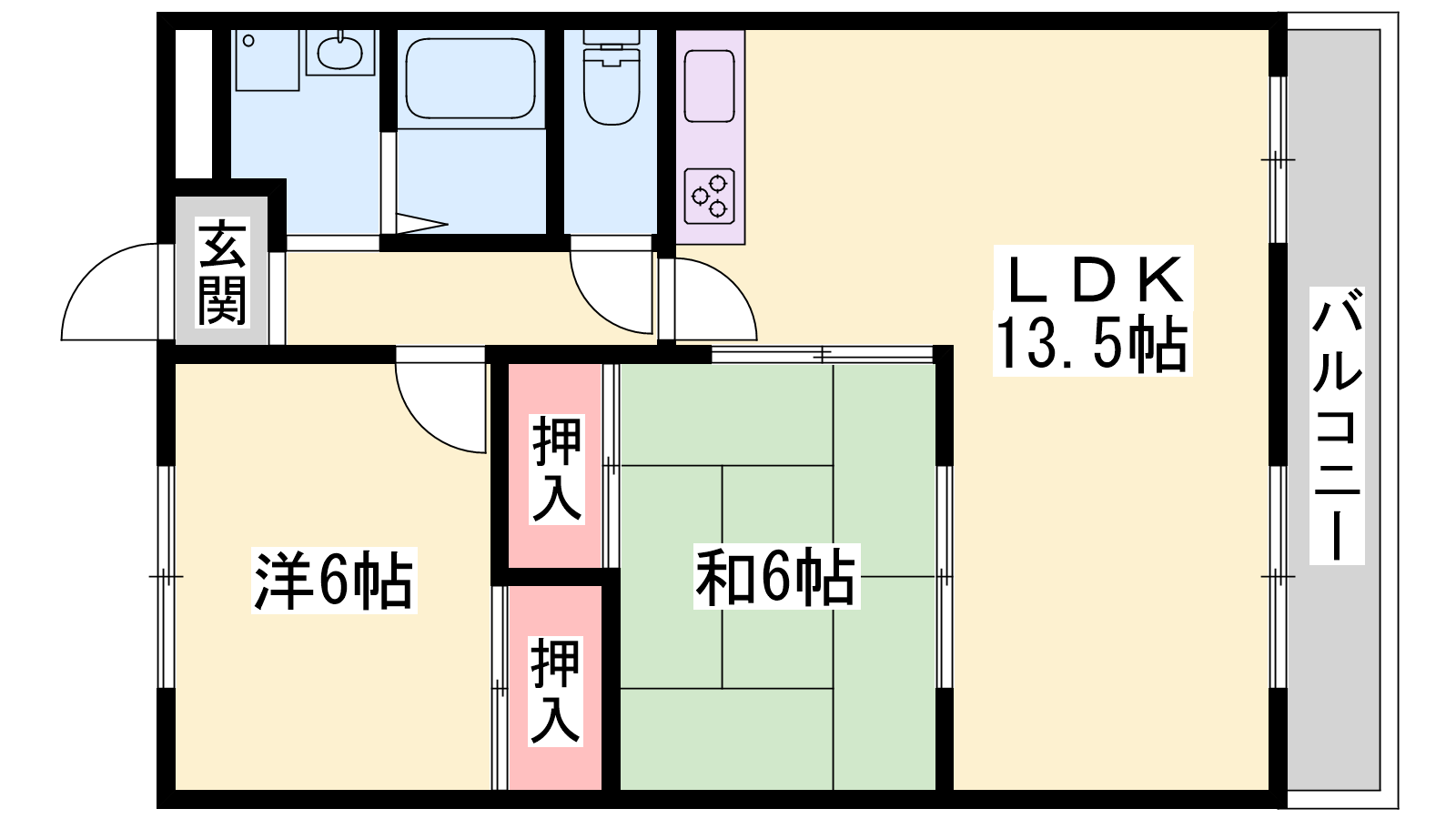 - DK13.5帖、洋室6帖、和室6帖