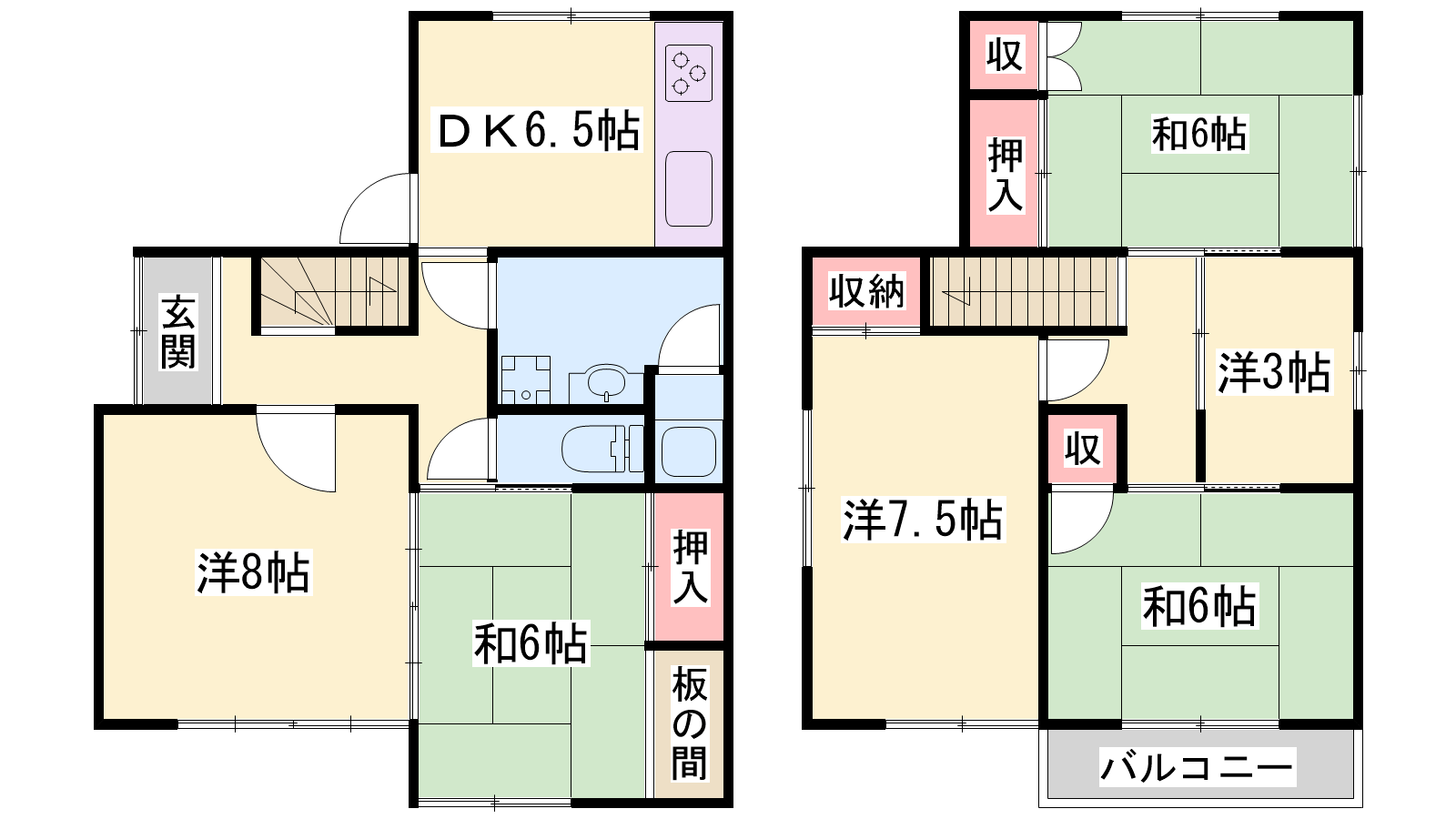 - DK6.5帖、洋室8帖、洋室7.5帖、和室6帖、和室6帖、和室6帖、S3帖