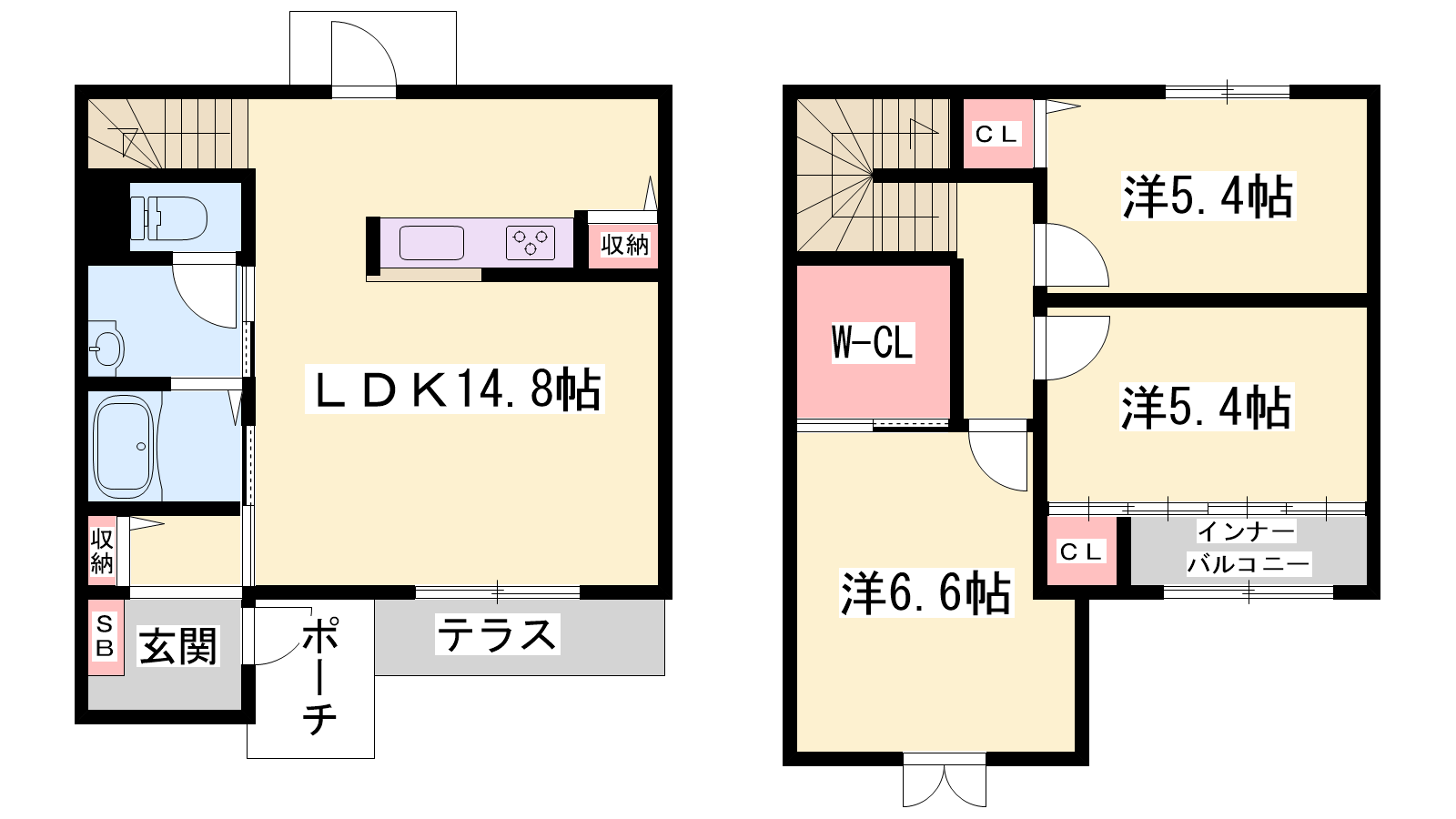 - LDK14.8帖、洋室6.6帖、洋室5.4帖、洋室5.4帖