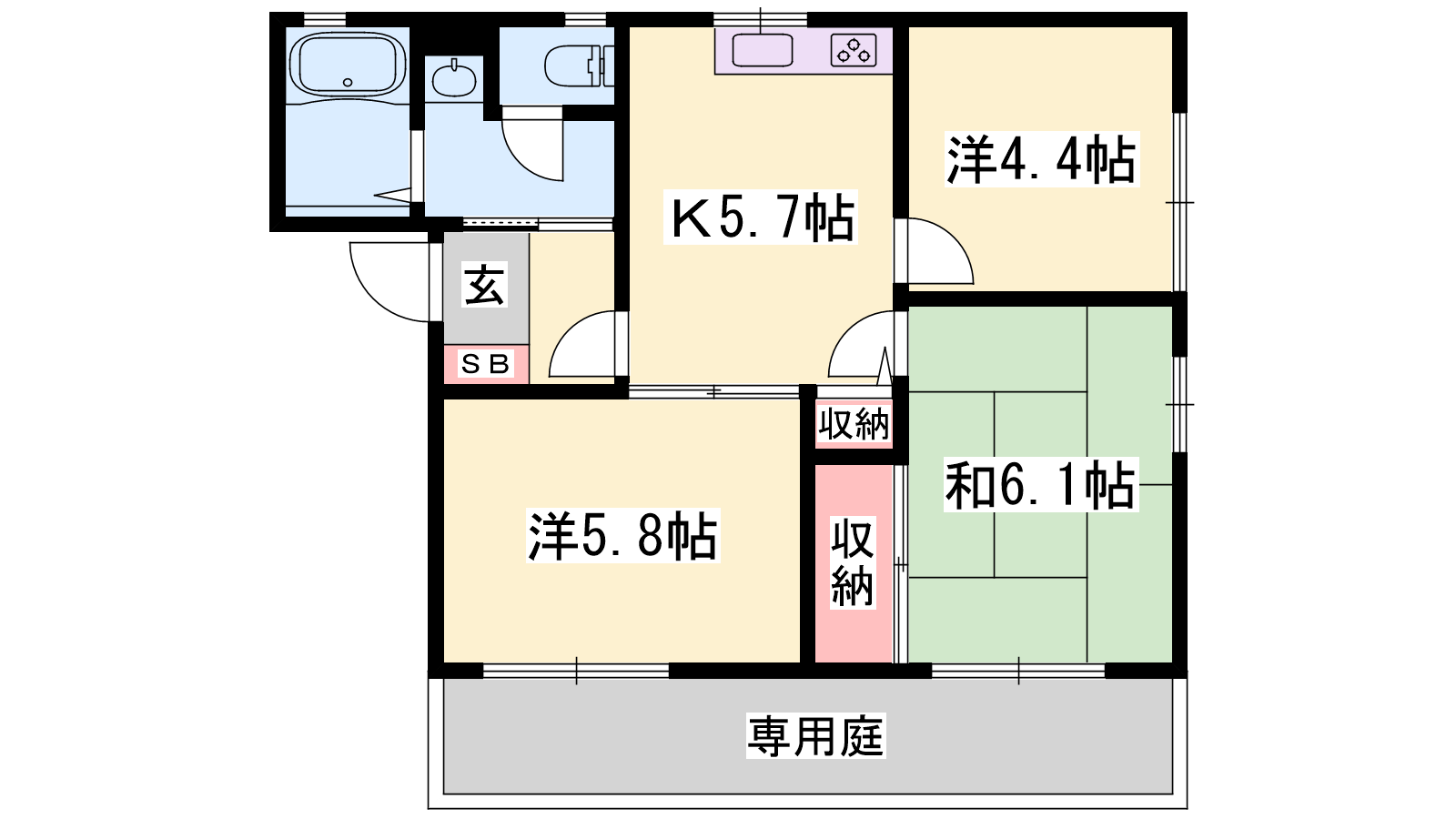 - K5.7帖、洋室5.8帖、洋室4.4帖、和室6.1帖