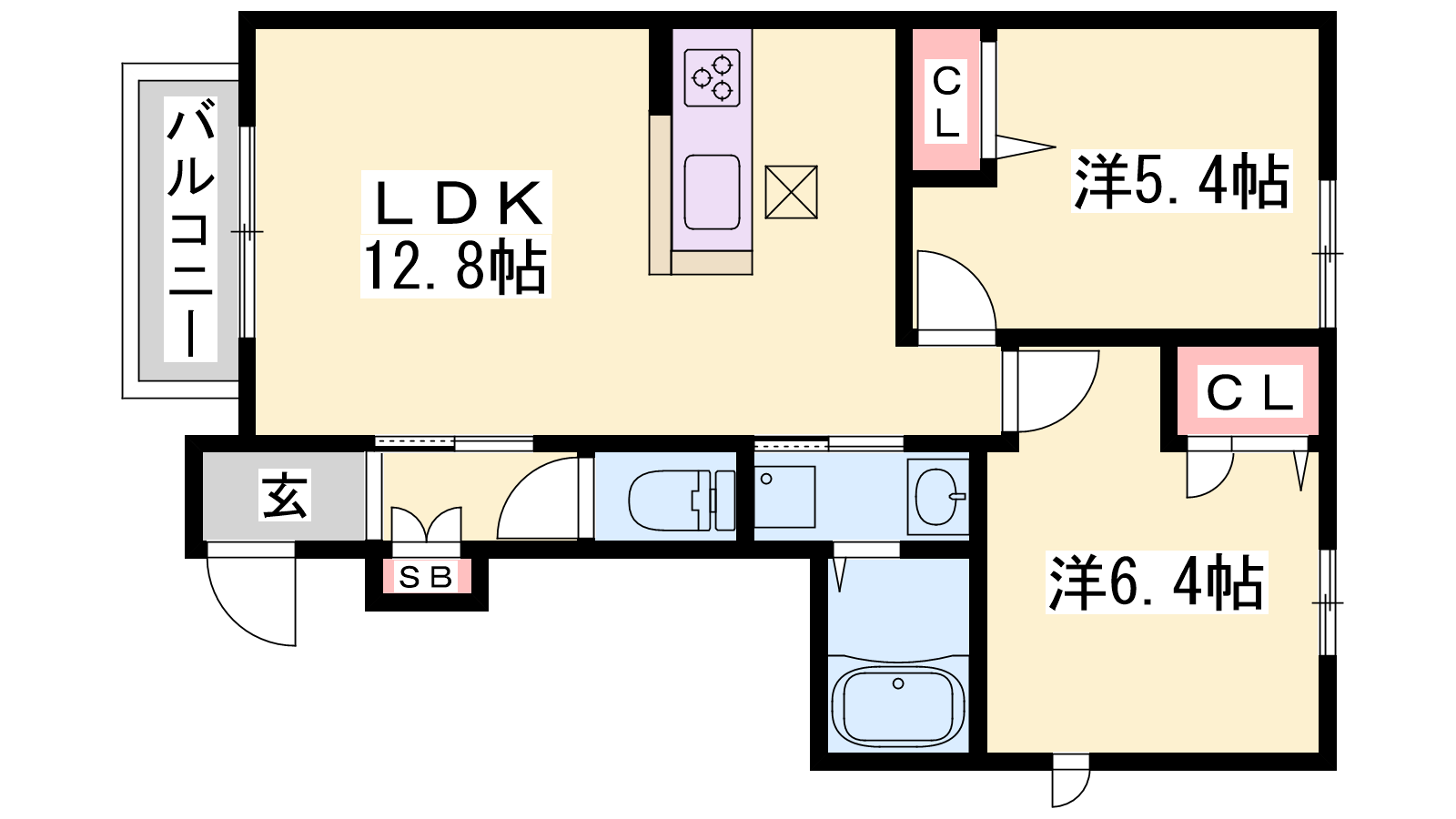 - LDK12.8帖、洋室6.4帖、洋室5.4帖