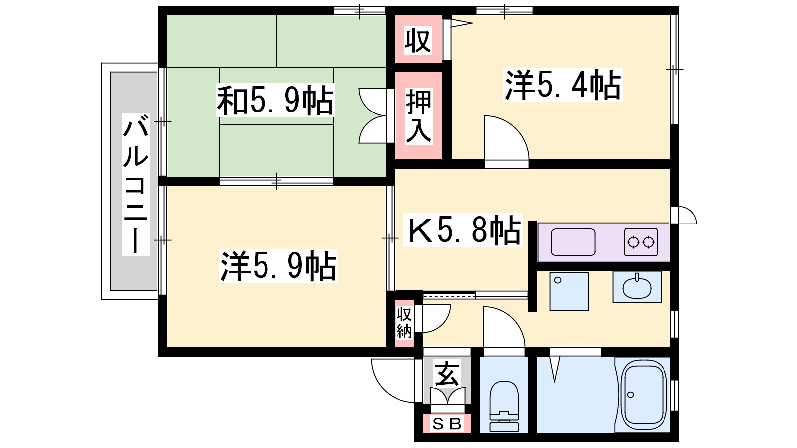 - K5.8帖、洋室5.4帖、洋室5.9帖、和室5.9帖