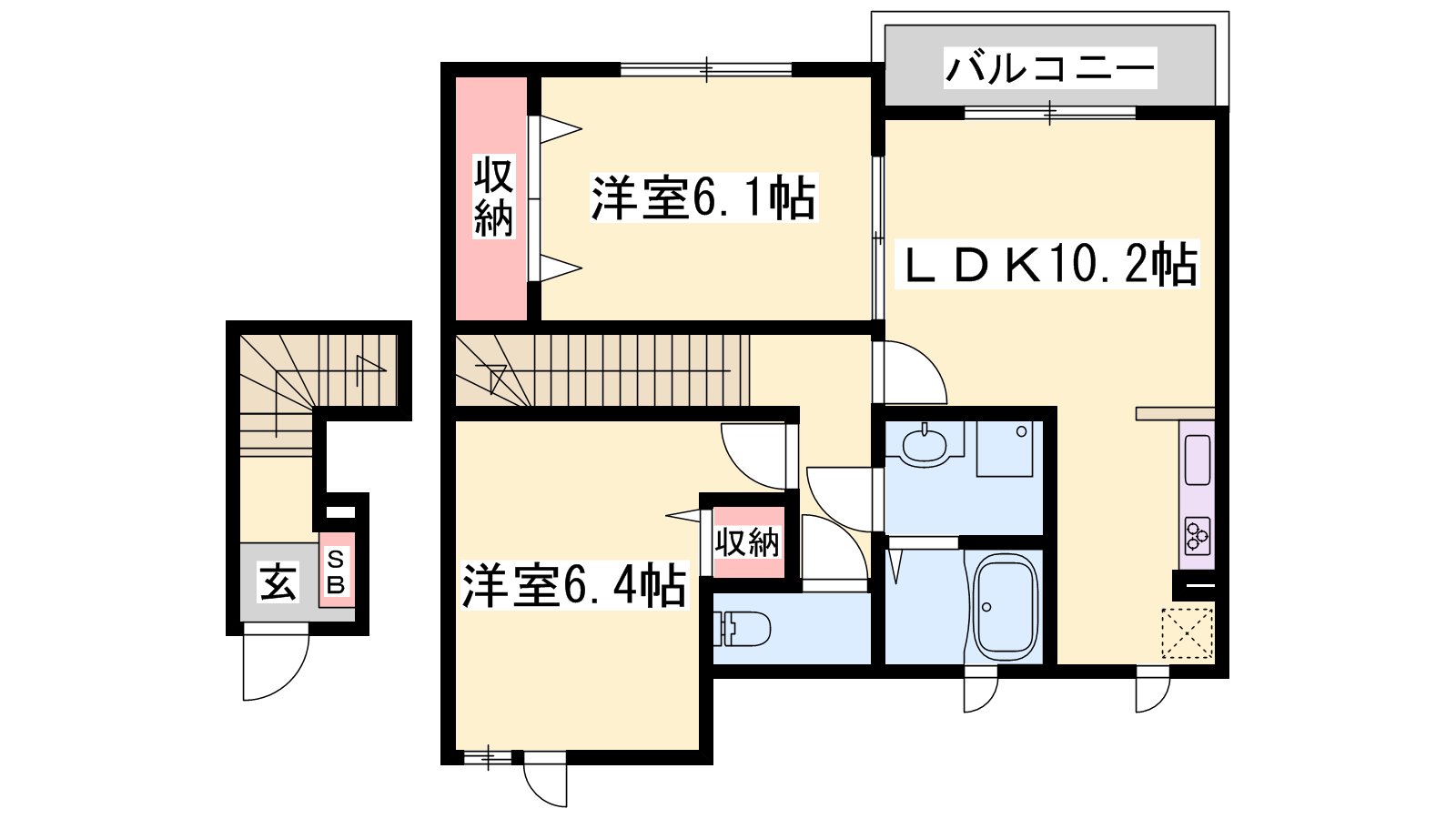 - LDK10.2帖、洋室6.1帖、洋室6.4帖