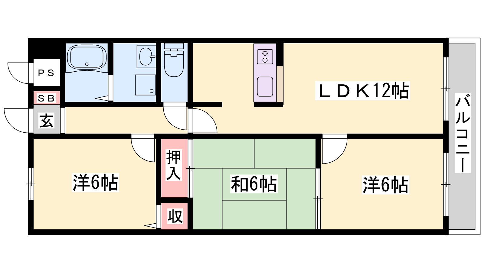 - LDK12帖、洋室6帖、洋室6帖、和室6帖