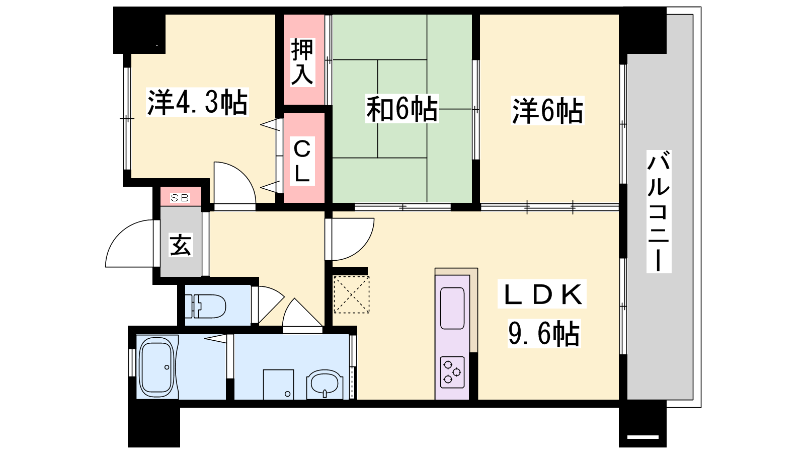 - LDK9.6帖、洋室6帖、和室6帖、洋室4.3帖