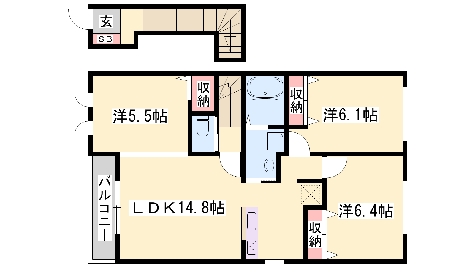 - LDK14.8帖、洋室6.1帖、洋室6.4帖、洋室5.5帖