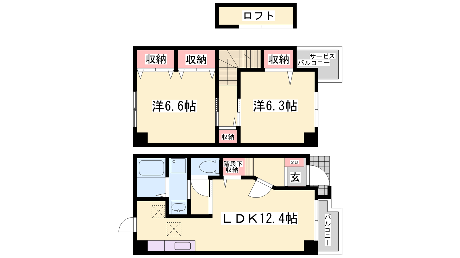 - LDK12.4帖、洋室6.6帖、洋室6.3帖