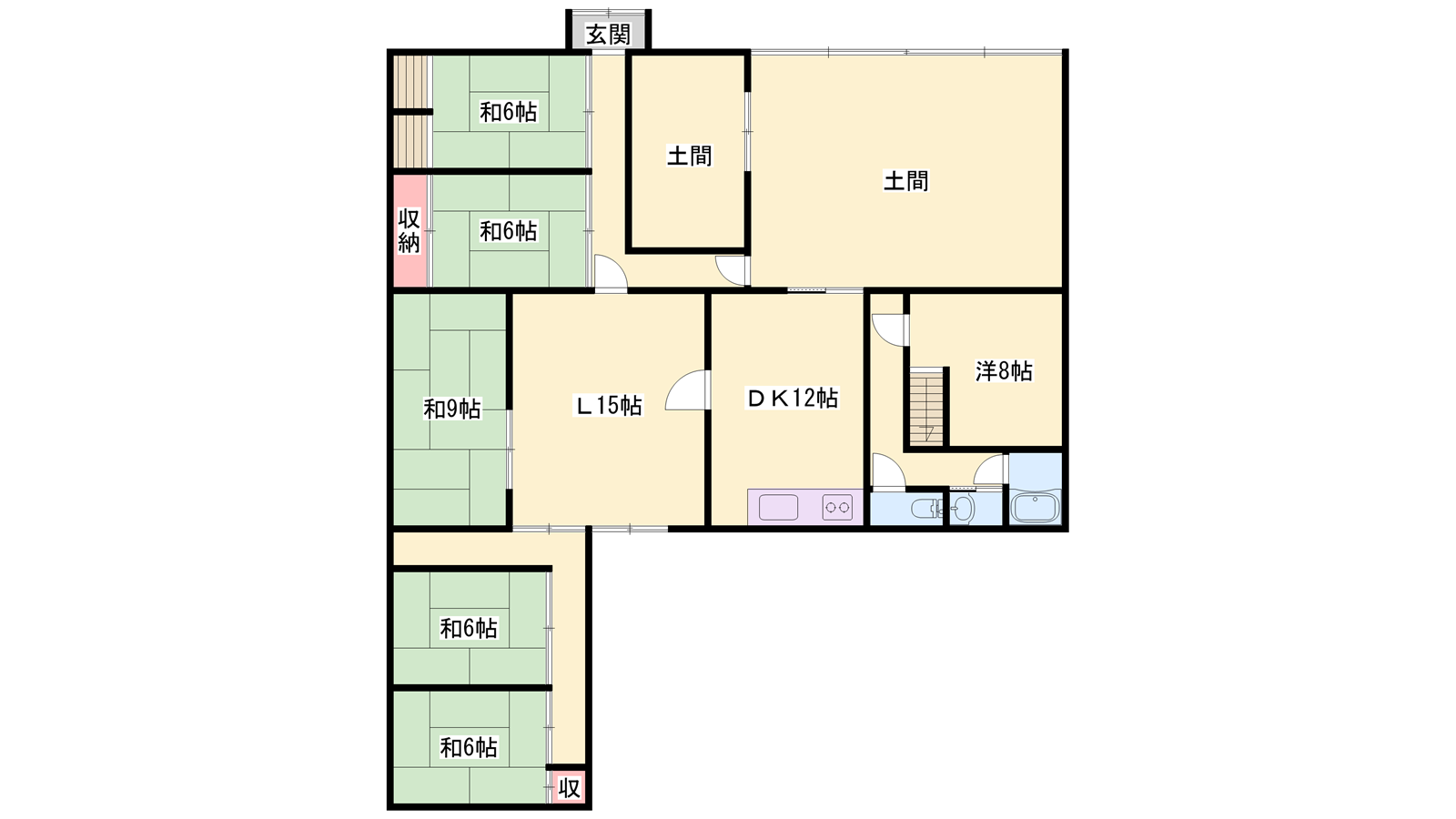 - L15帖、和室6帖、和室6帖、和室6帖、和室6帖、和室9帖、DK12帖、洋室6帖