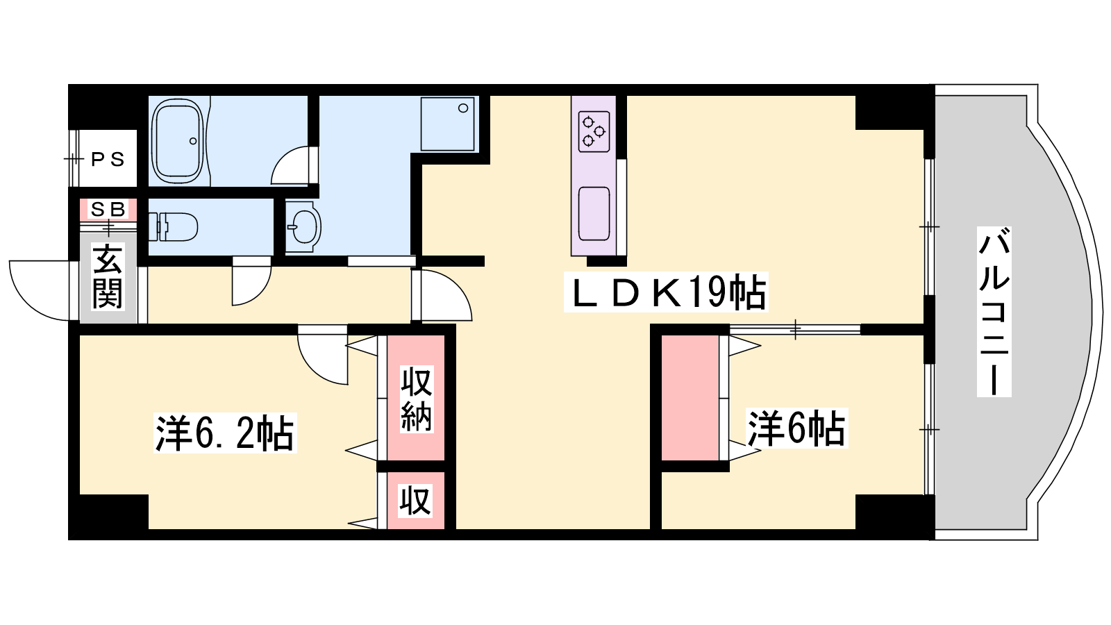 - LDK19帖、洋室6.2帖、洋室6帖