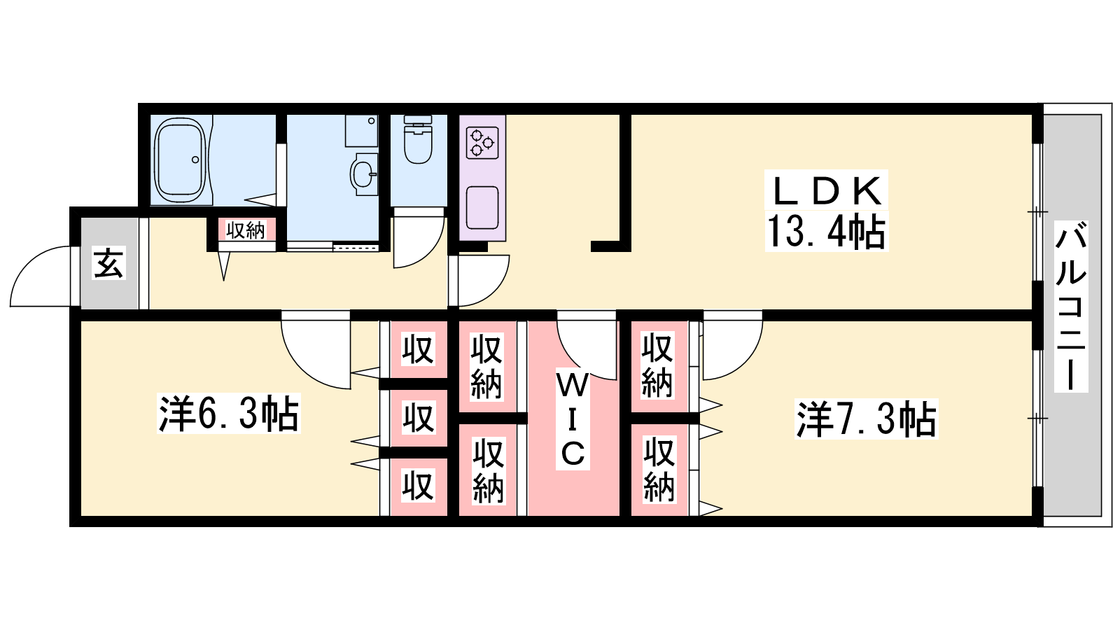 - LDK13.4帖、洋室7.3帖、洋室6.3帖