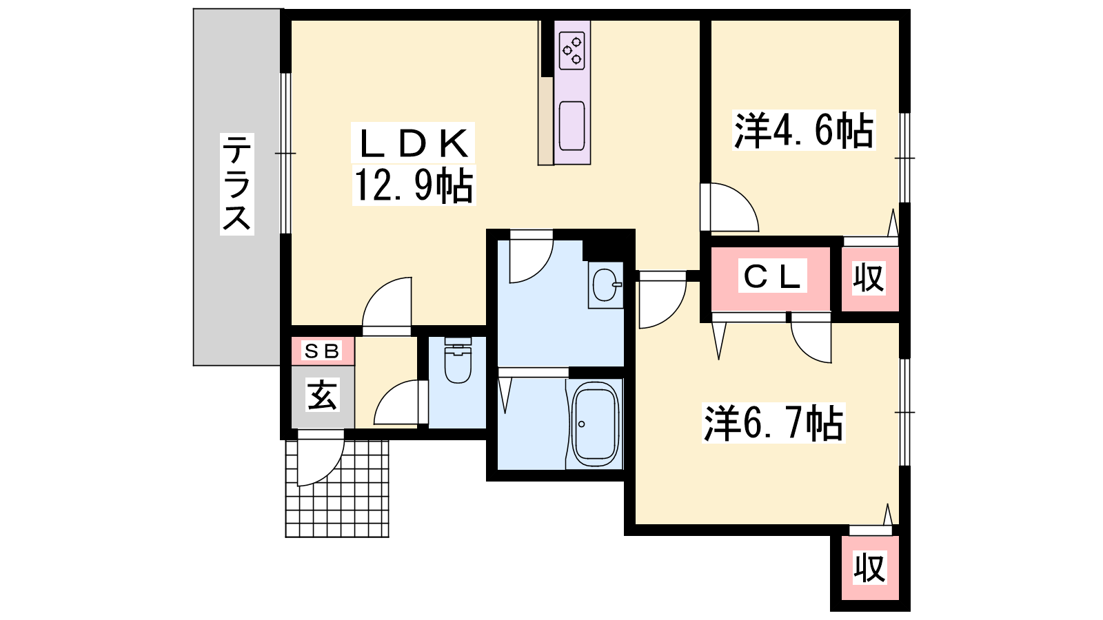 - LDK12.9帖、洋室6.7帖、洋室4.6帖