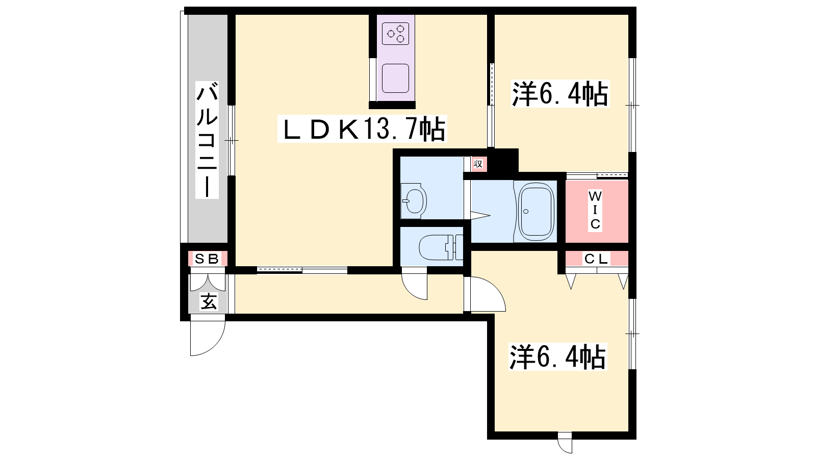 - LDK13.7帖、洋室6.4帖、洋室6.4帖