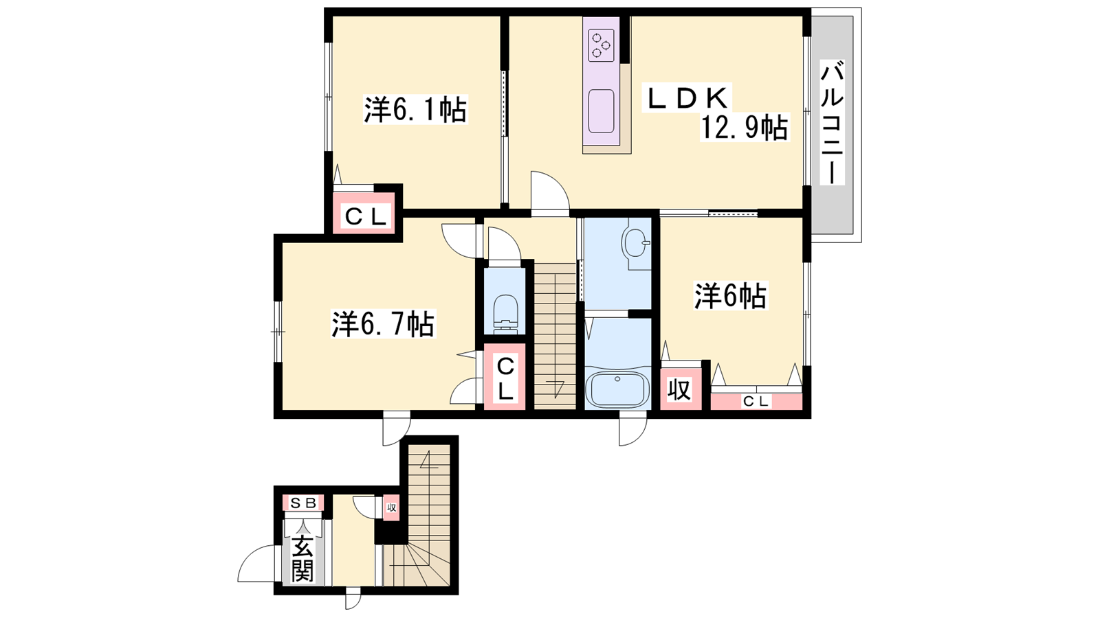- LDK12.9帖、洋室6.7帖、洋室6.1帖、洋室6帖