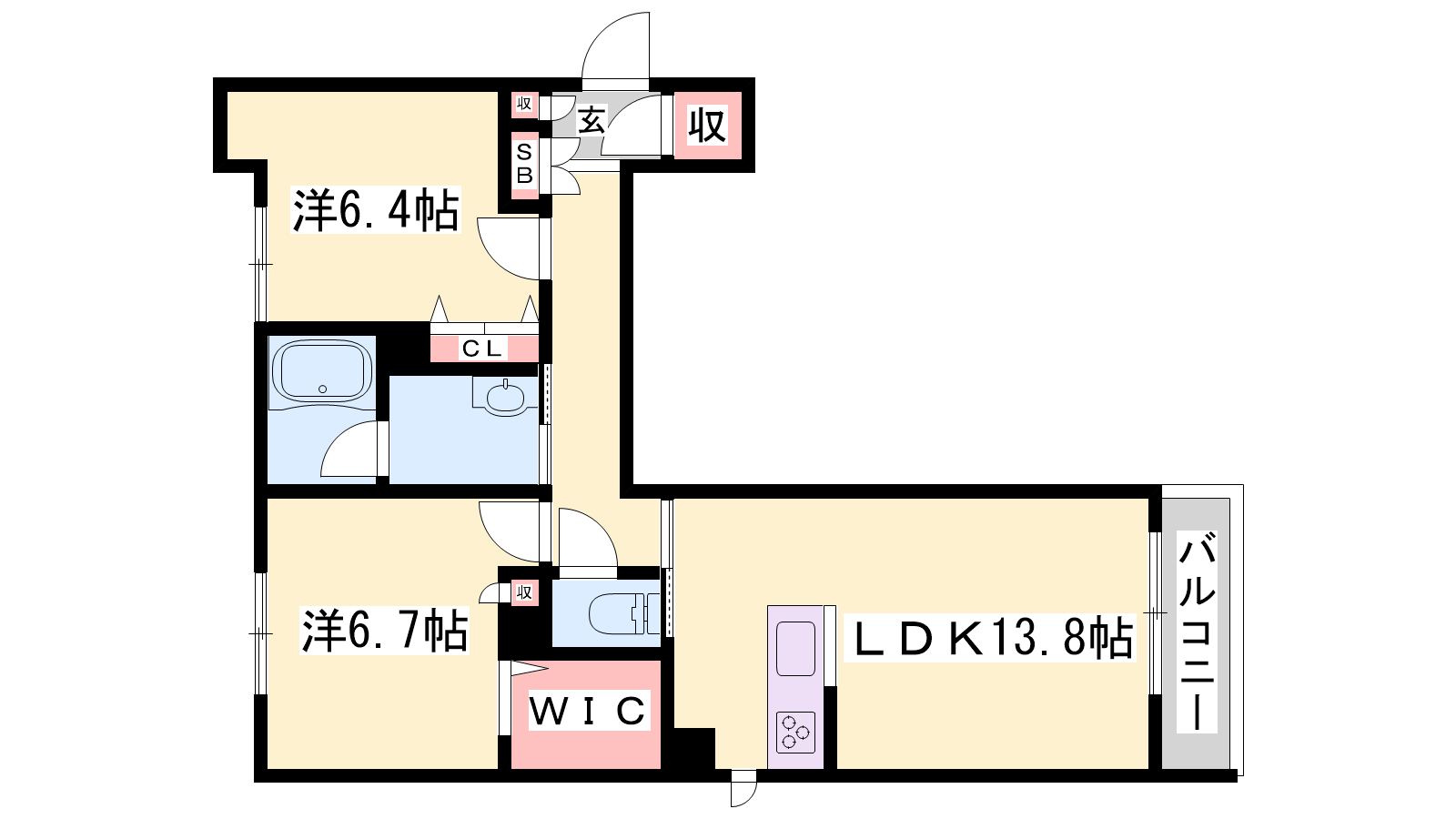 - LDK13.8帖、洋室6.7帖、洋室6.4帖