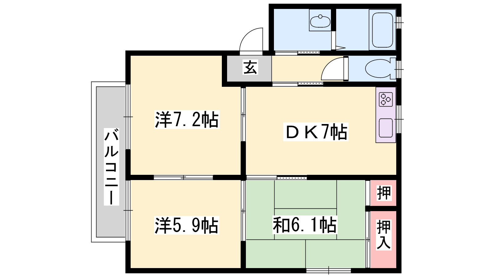 - DK7帖、和室6.1帖、洋室7.2帖、洋室5.9帖