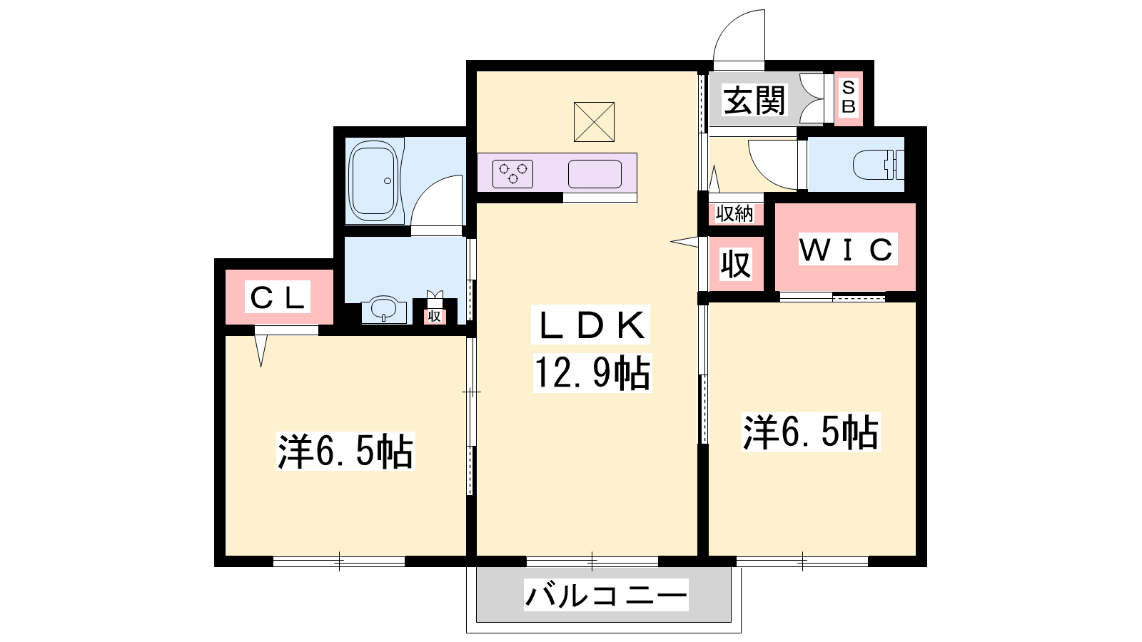 - LDK12.9帖、洋室6.5帖、洋室6.5帖