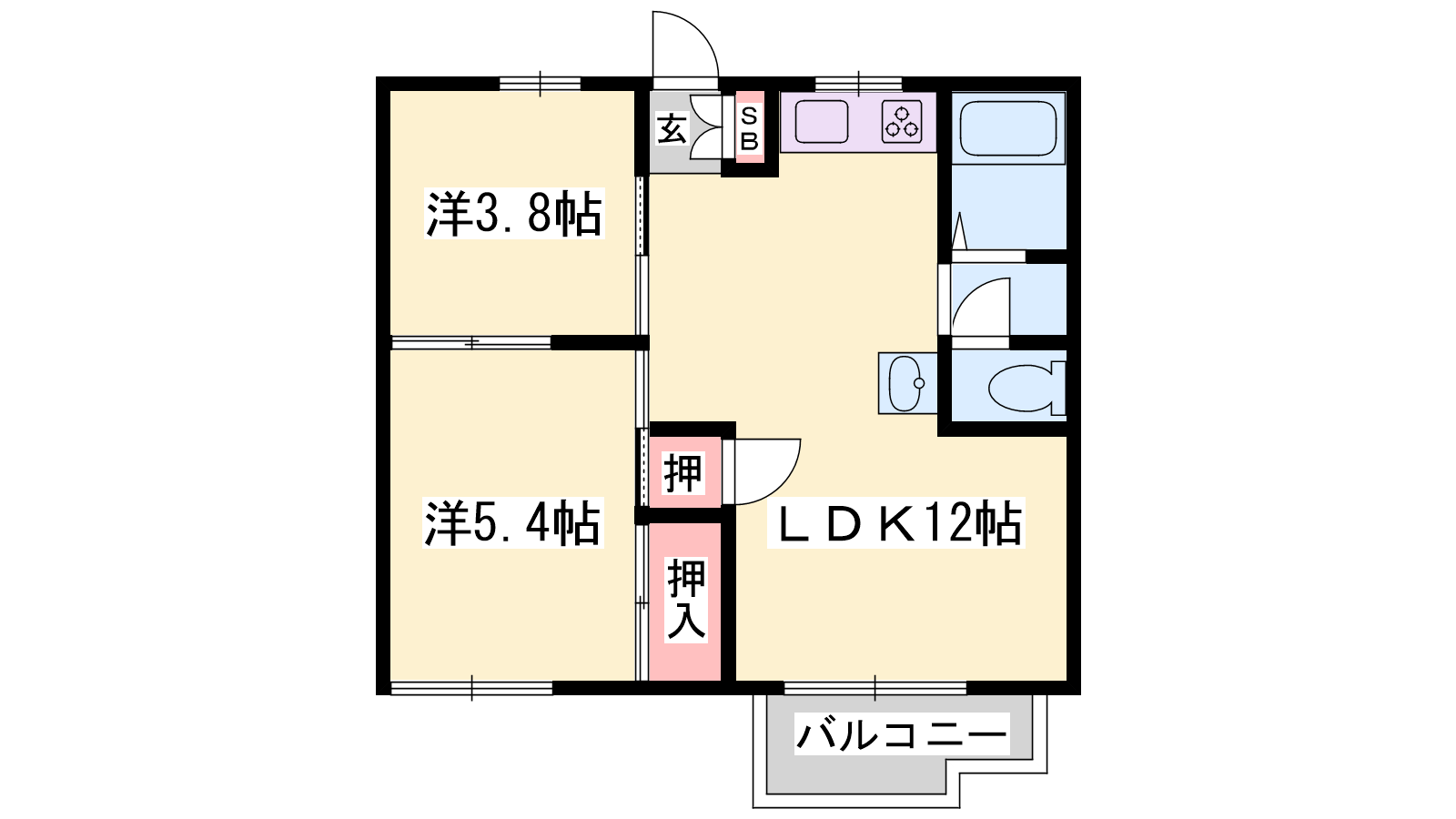 - LDK12帖、洋室5.4帖、洋室3.8帖