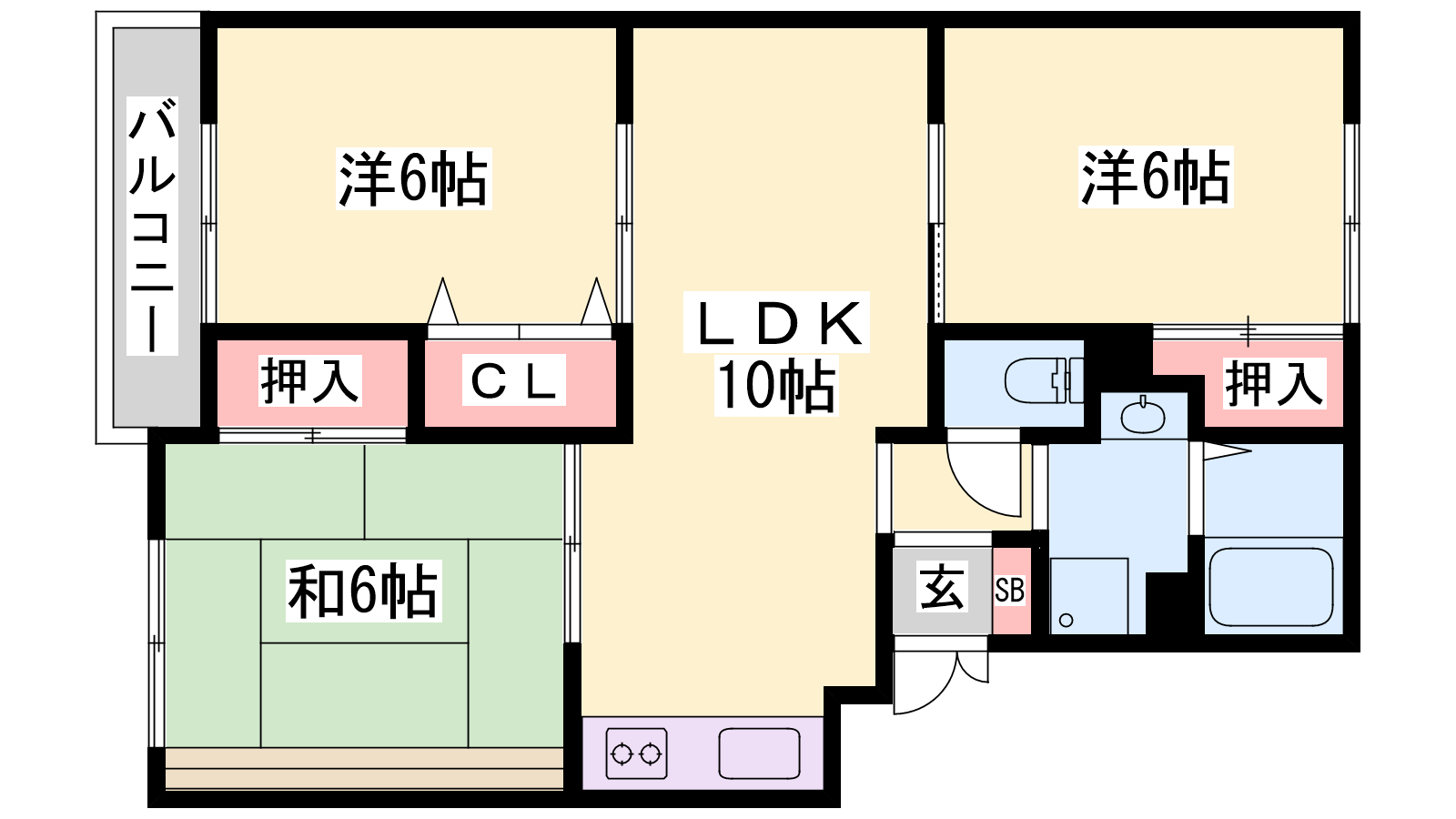 - LDK10帖、洋室6帖、洋室6帖、和室6帖