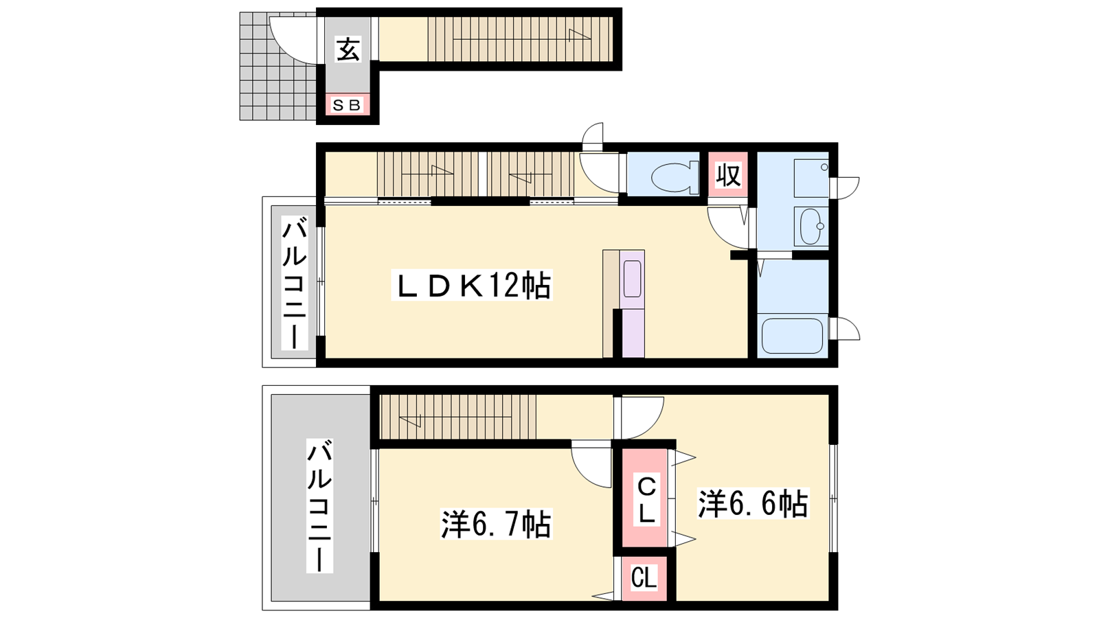 - LDK12帖、洋室6.6帖、洋室6.7帖