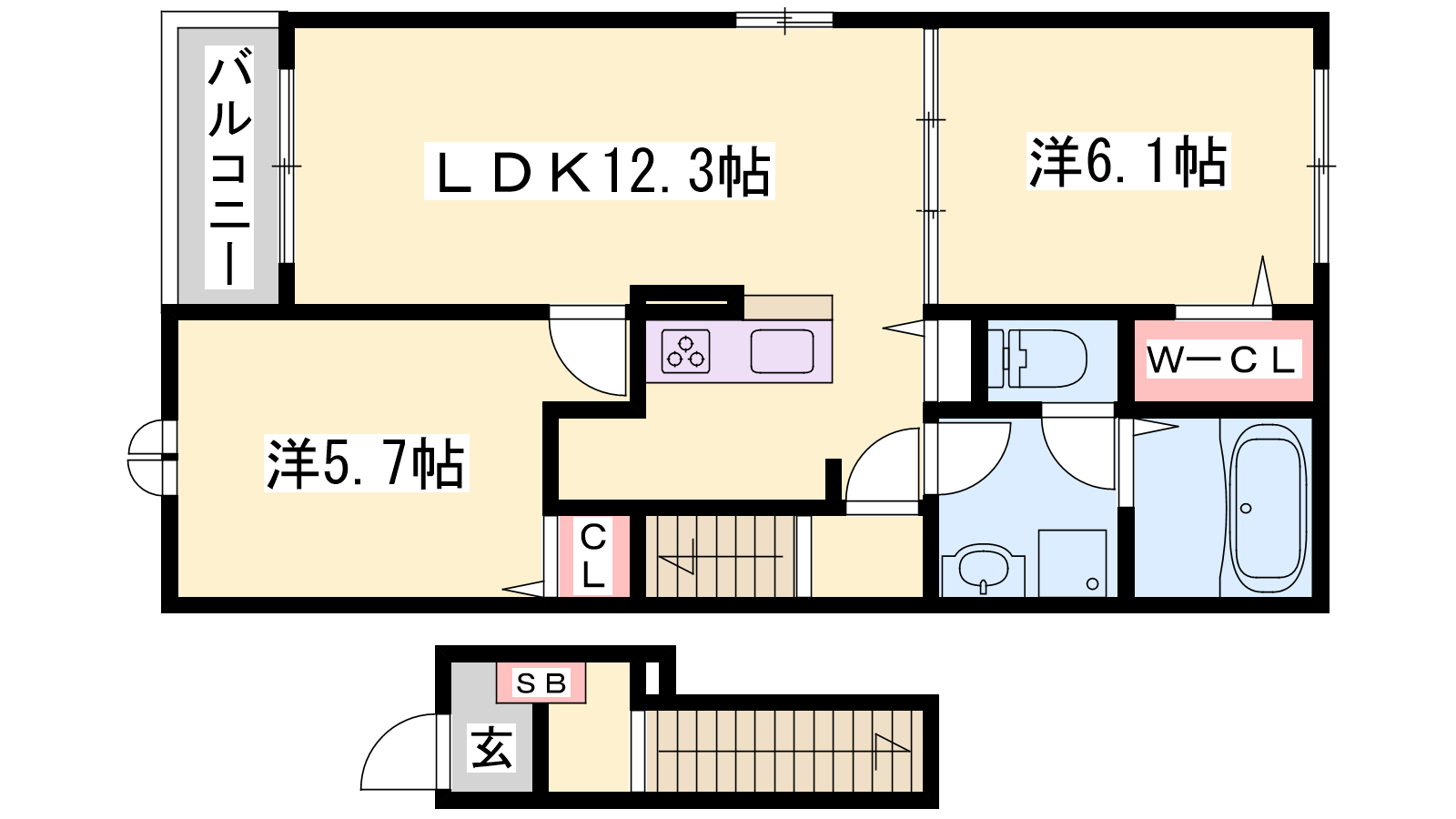 - LDK12.3帖、洋室6帖、洋室5.7帖