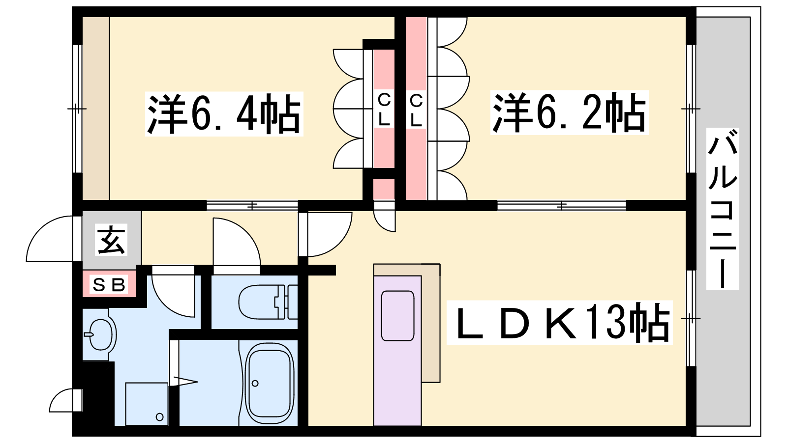 - LDK13帖、洋室6.4帖、洋室6.2帖