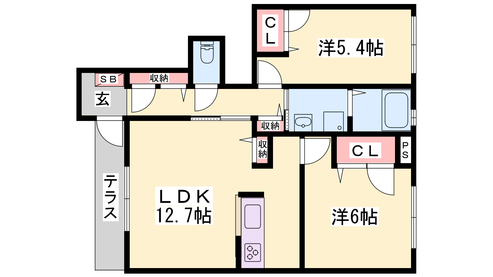 - LDK12.7帖、洋室6帖、洋室5.4帖