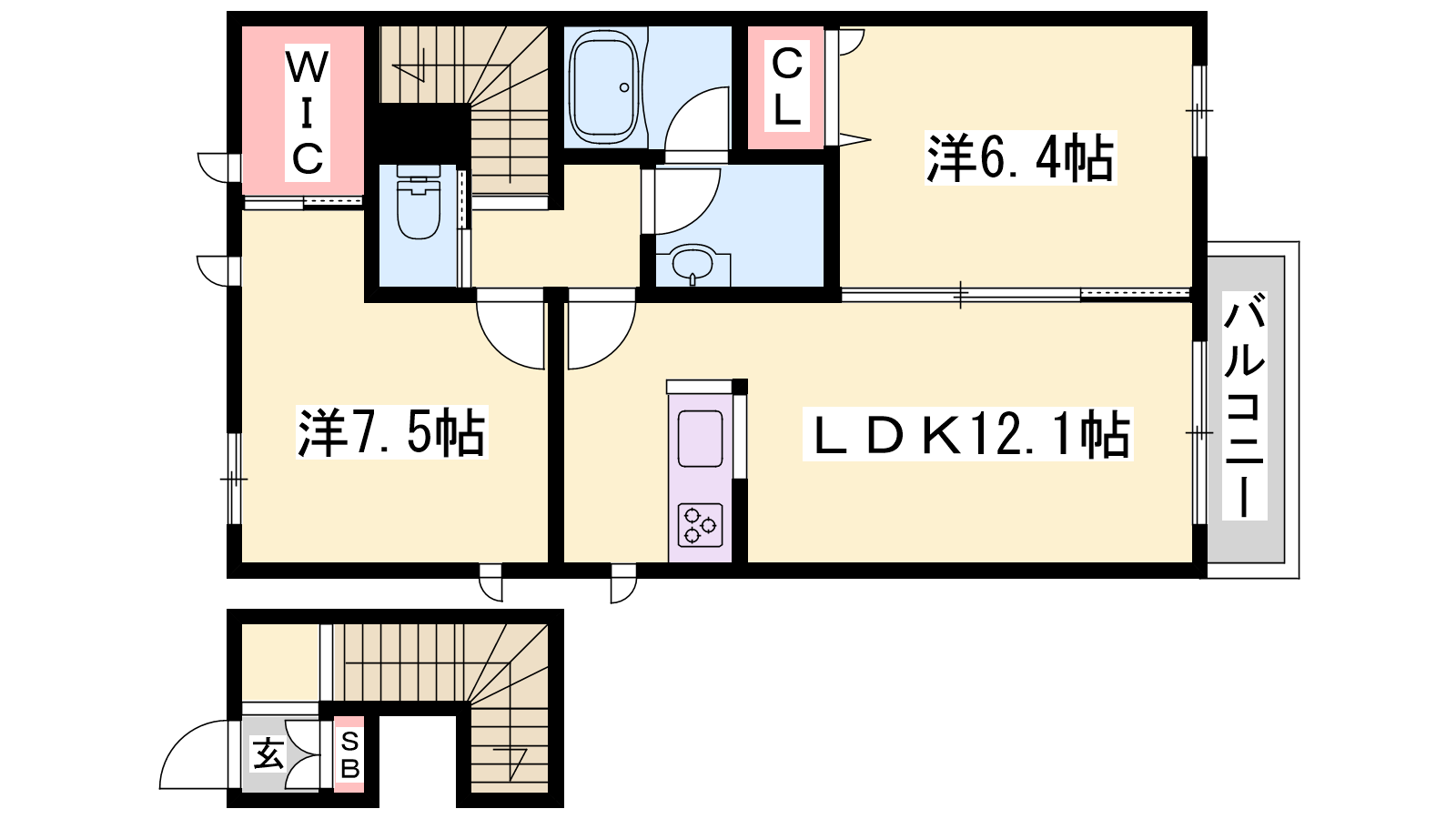 - LDK12.1帖、洋室7.5帖、洋室6.4帖