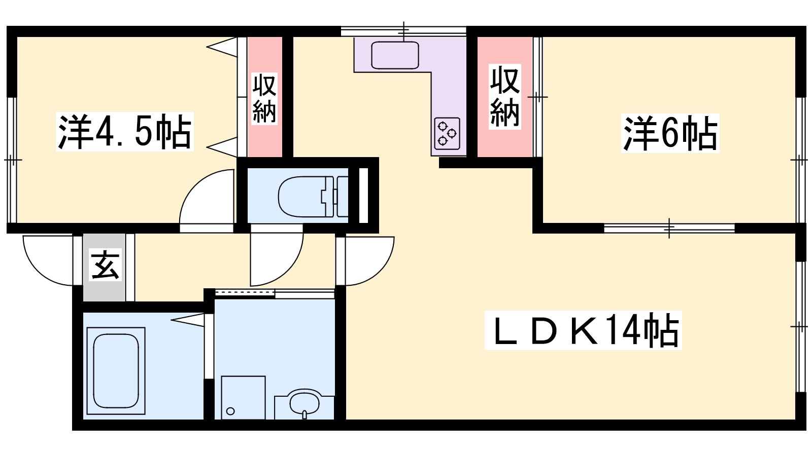 - LDK14帖、洋室4.5帖、洋室6帖