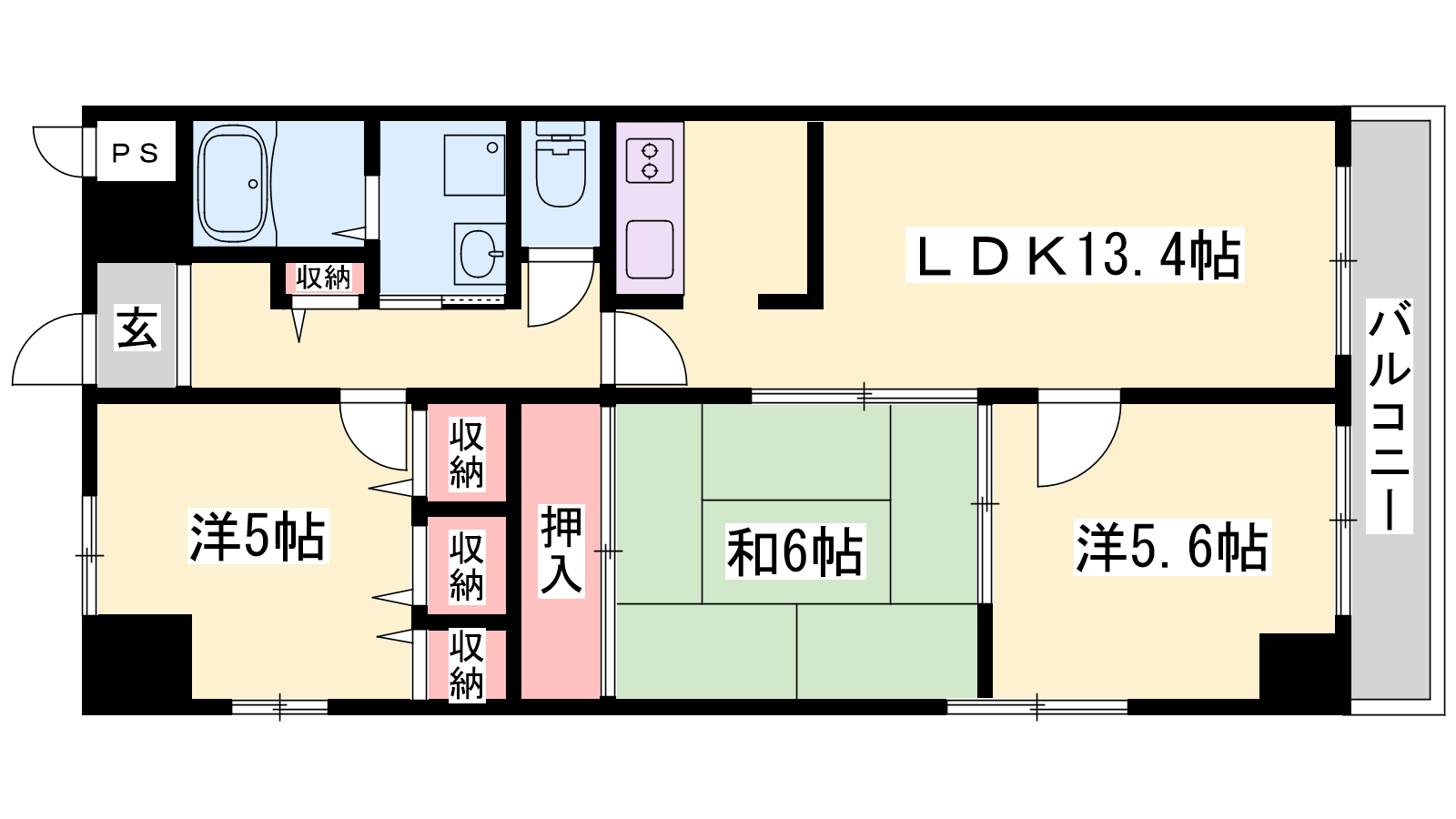 - LDK13.4帖、洋室5.6帖、洋室5帖、和室6帖