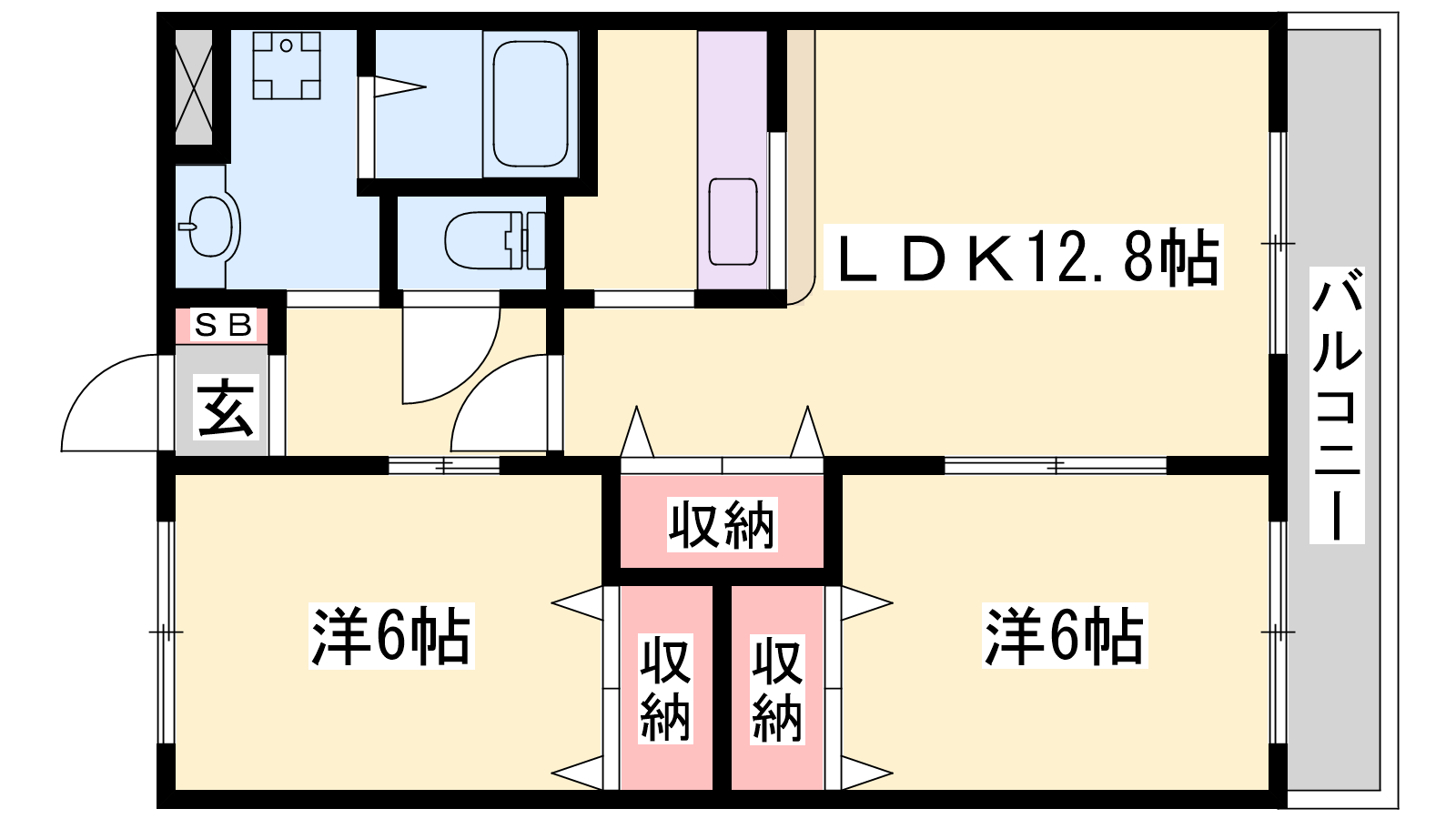 - LDK12.8帖、洋室6帖、洋室6帖