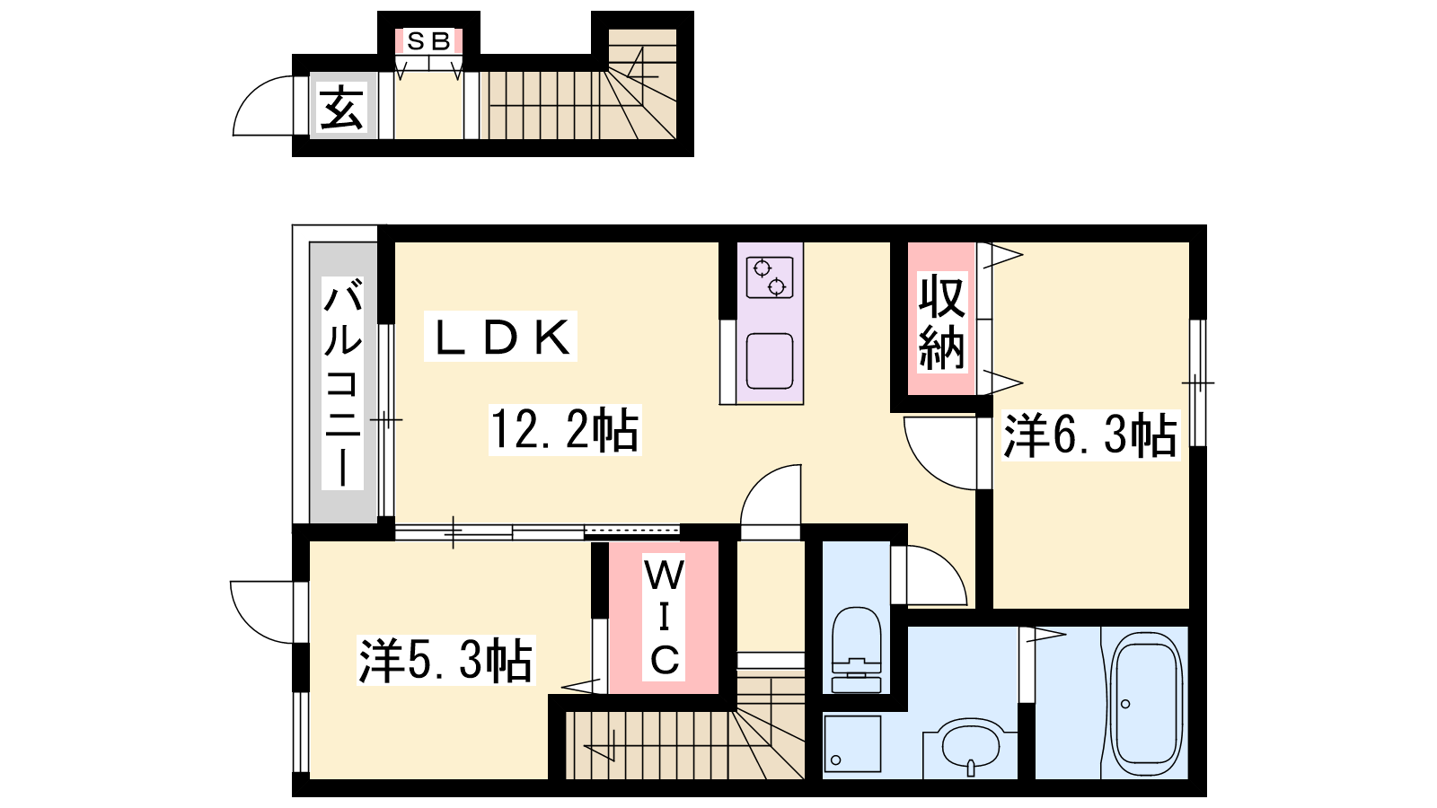 - LDK12.2帖、洋室6.3帖、洋室5.3帖