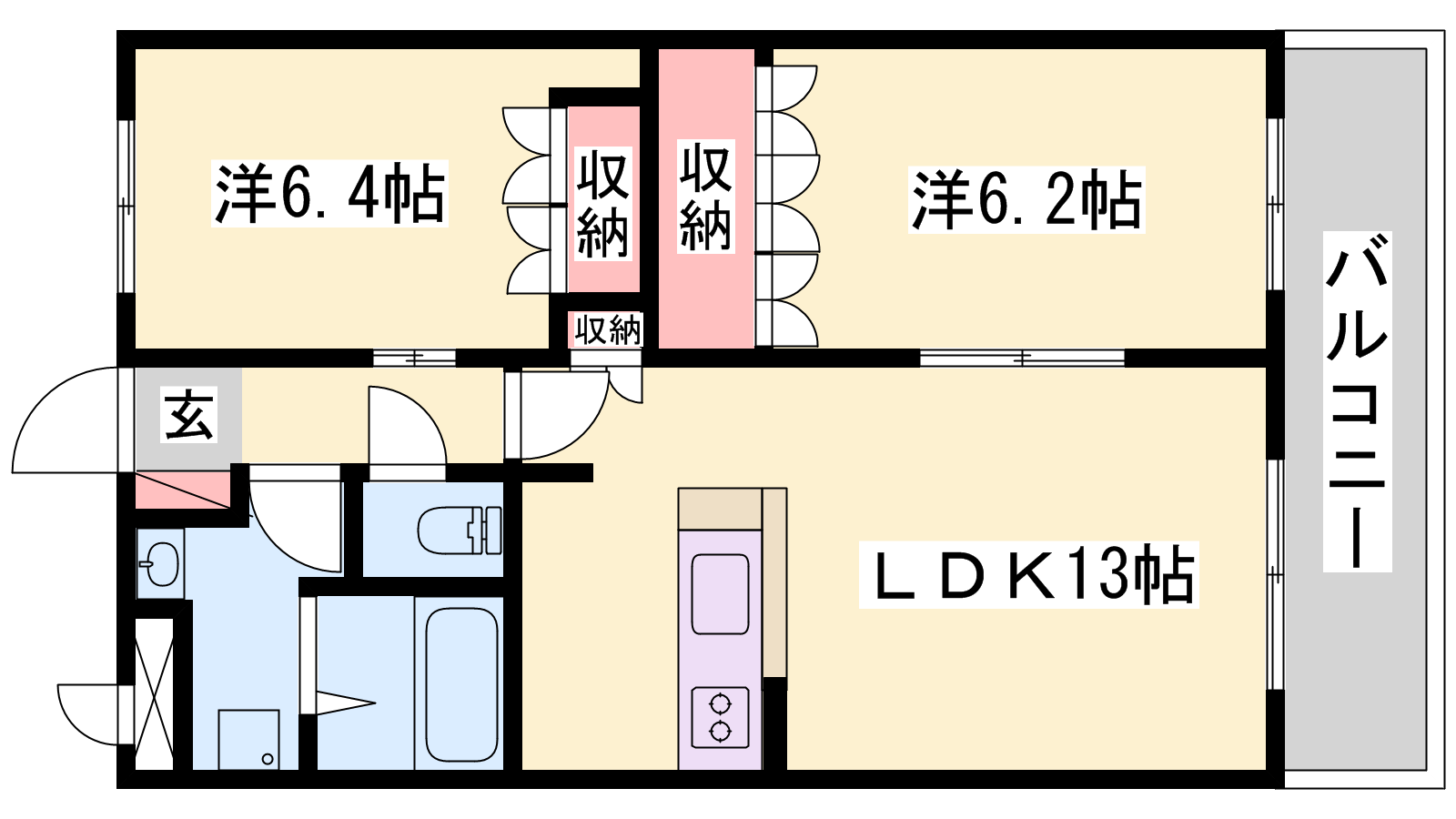- LDK13帖、洋室6.4帖、洋室6.2帖