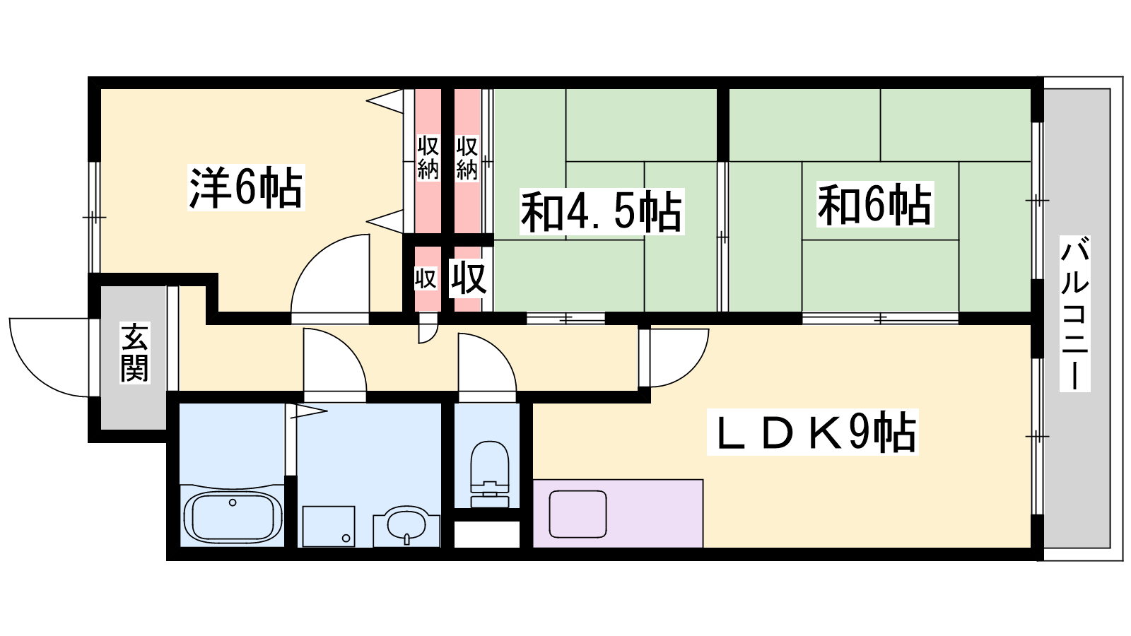 - LDK9帖、洋室6帖、和室6帖、和室4.5帖