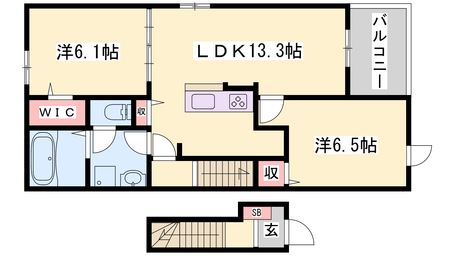 - LDK13.3帖、洋室6.1帖、洋室6.5帖